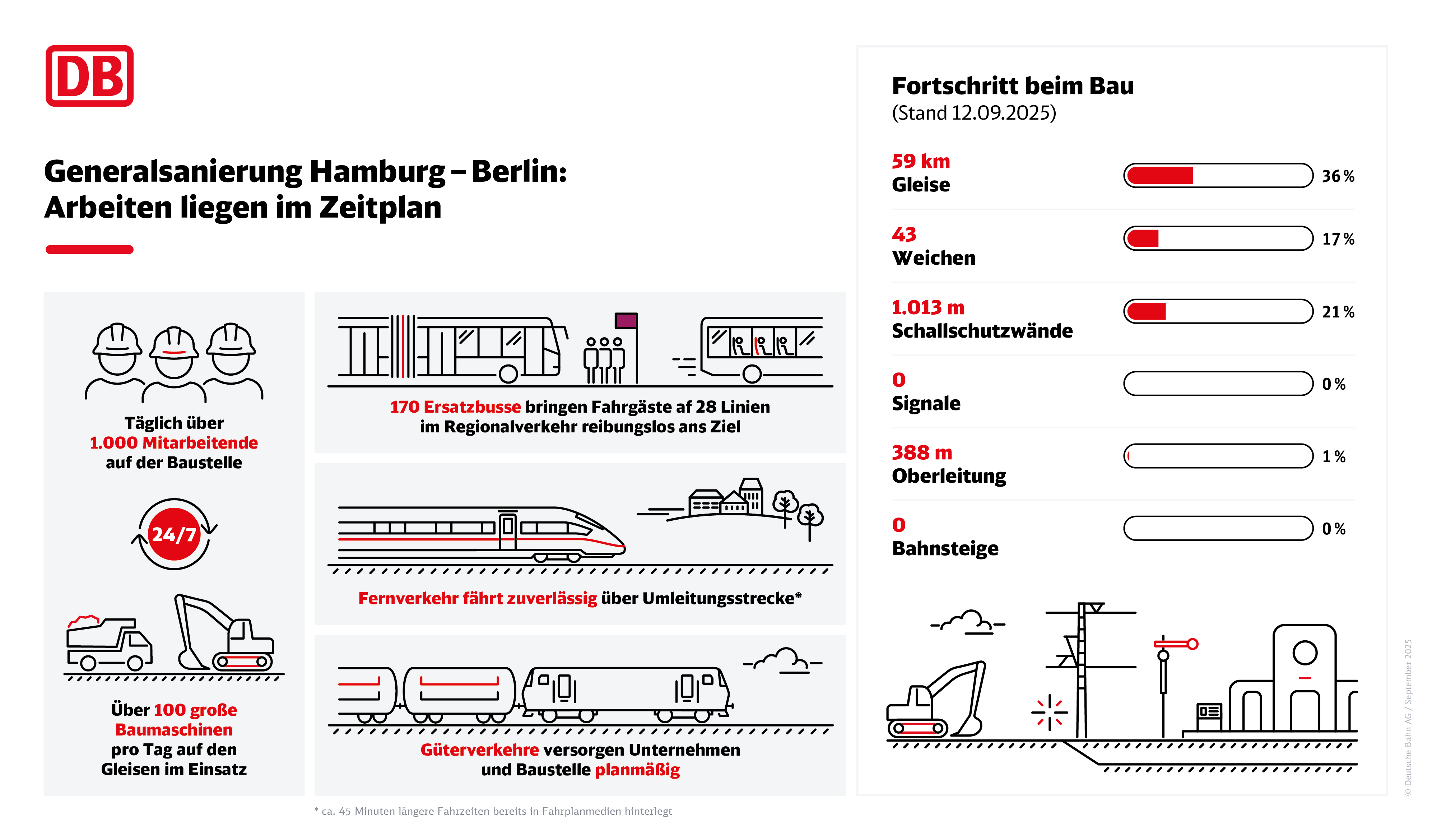 Die Generalsanierung der Strecke Hamburg–Berlin geht planmäßig voran. Mitarbeitende der DB und der beteiligten Bauunternehmen haben seit dem Start am 1. August bereits mehr als 4 Kilometer Gleise sowie mehrere Weichen erneuert. Stellwerke wurden außer Betrieb genommen, Kabel und Weichenantriebe sowie Magnete zum Steuern der Signale demontiert. Auch an den Bahnhöfen entlang der Strecke sind die Bauteams im Einsatz, derzeit vor allem in Wittenberge und Büchen. Ebenfalls erfolgreich gestartet sind Gründungsarbeiten für die Errichtung von Oberleitungsmasten sowie vorbereitende Arbeiten zur Erneuerung von Schallschutzwänden. Pro Tag sind bis zu 100 schwere Baumaschinen sowie bis zu 1.000 Mitarbeitende der DB und der beteiligten Bauunternehmen im Einsatz.