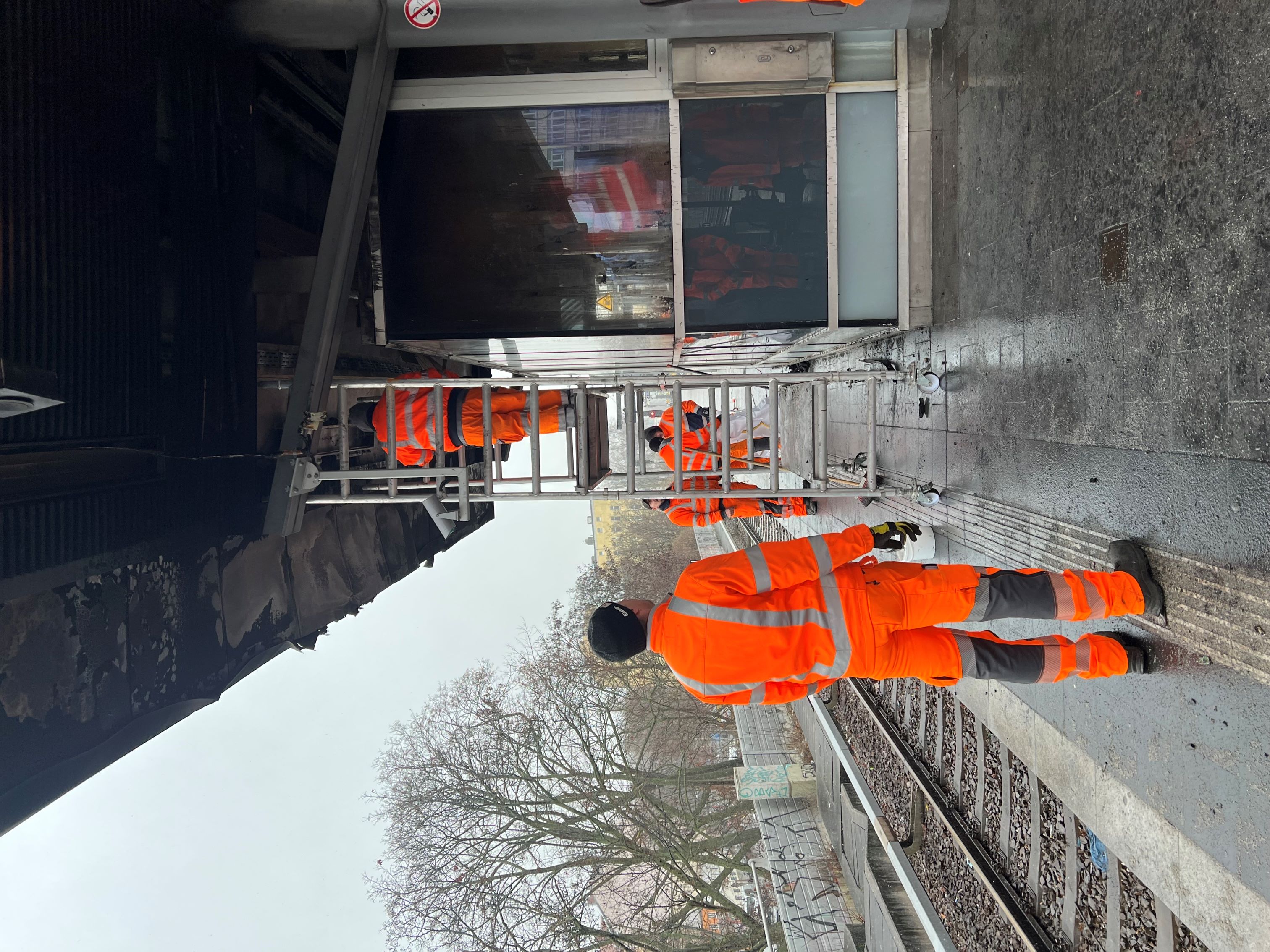 Reparaturteams der Deutschen Bahn arbeiten seit dem Vormittag daran, das Bahnsteigdach teilweise abzubauen, um zu verhindern, dass beschädigte und lose Teile herabfallen. Ziel ist es, diese Arbeiten so schnell wie möglich abzuschließen, damit die S-Bahn den durchgehenden Zugverkehr mit den Linien S41 und S42 wieder aufnehmen kann. Die Züge werden dann zunächst ohne Halt am Bahnhof Wedding durchfahren.