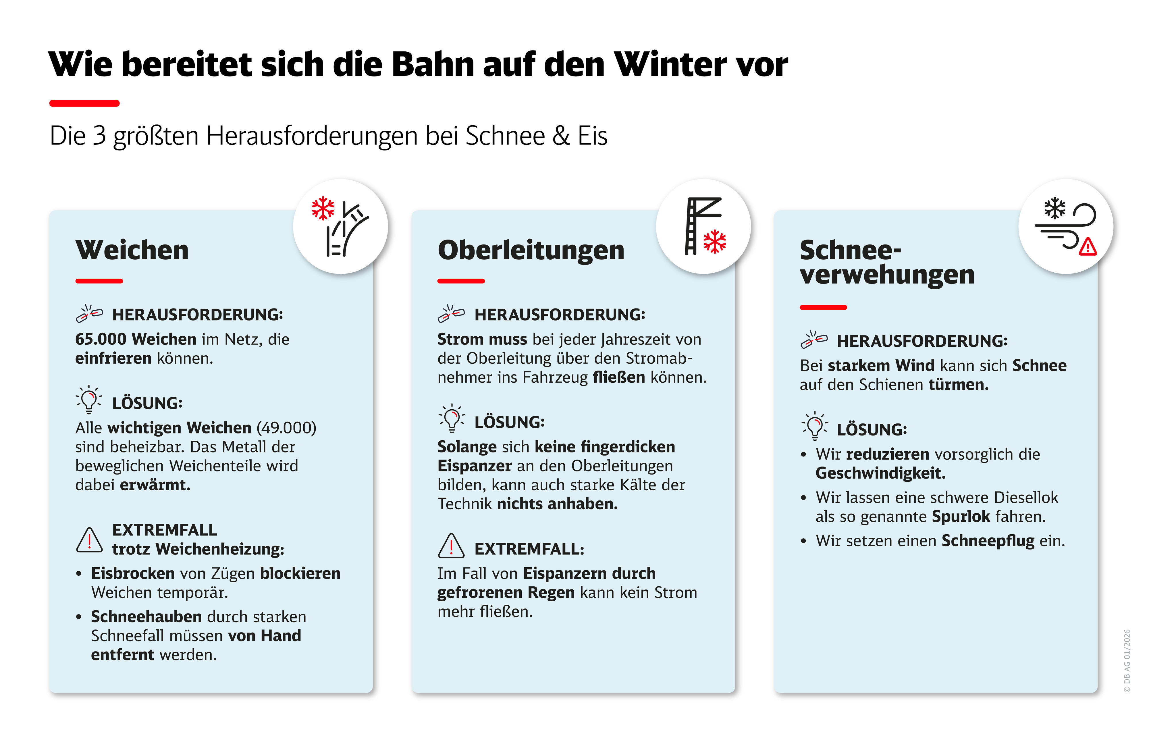 Anders als im Straßenverkehr sind Züge auch bei Eis und Schnee sicher unterwegs. Schwierig wird es nur, wenn es bei starkem Wind zu Verwehungen kommt und der Schnee sich auf den Schienen auftürmt. Dann können wir folgendes tun: