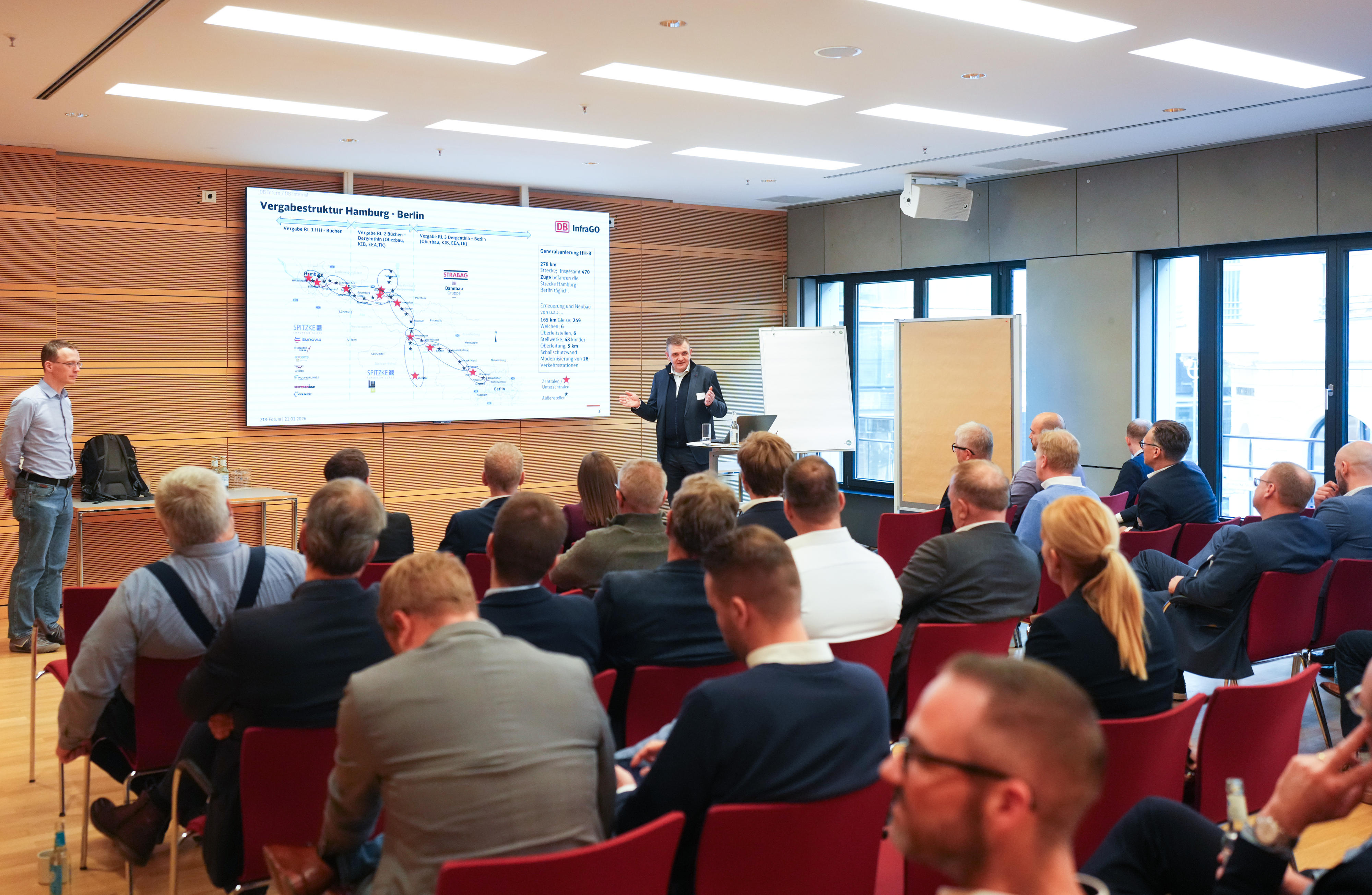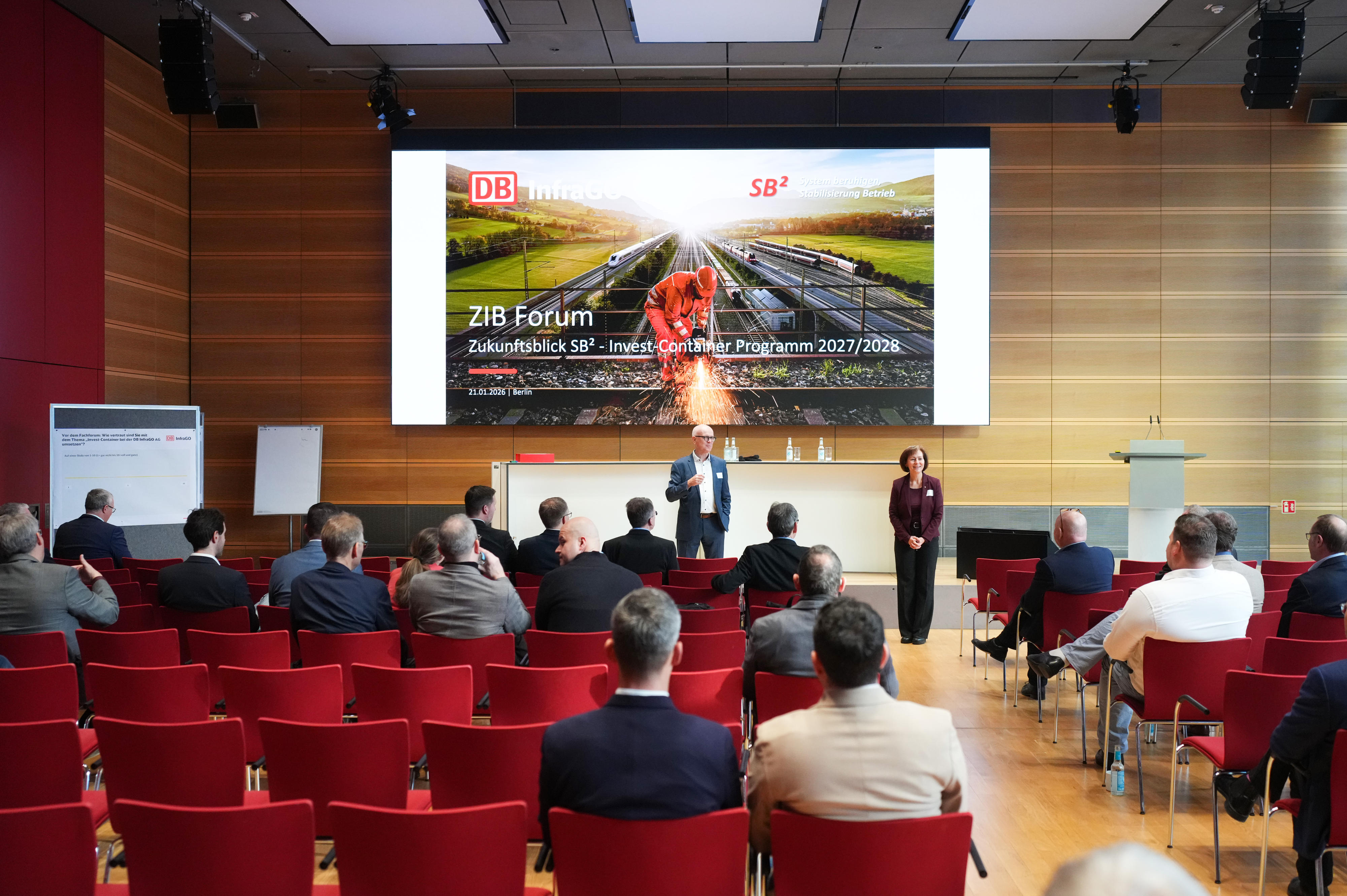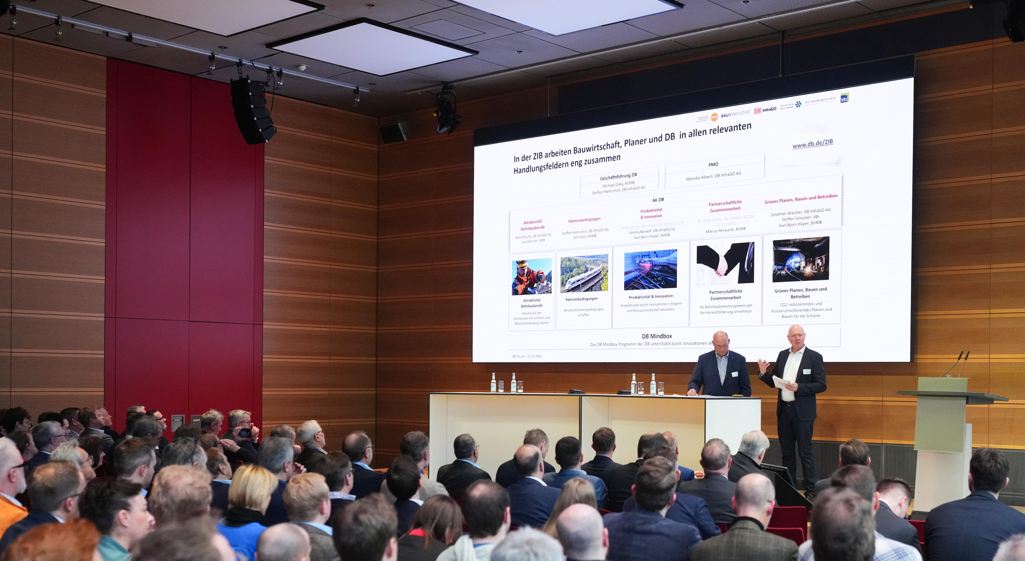 Die beiden Geschäftsführer der ZIB, Michael Gilka (Hauptgeschäftsführer BVMB) und Steffen Hantschick (DB InfraGO AG – Leiter Vertragsmanagement und Verbände), eröffneten am 21.01.2026 in Berlin das ZIB-Forum. Sie begrüßten rund 250 Vertreterinnen und Vertreter aus der Bauwirtschaft, den Planungsbüros sowie der Deutschen Bahn.