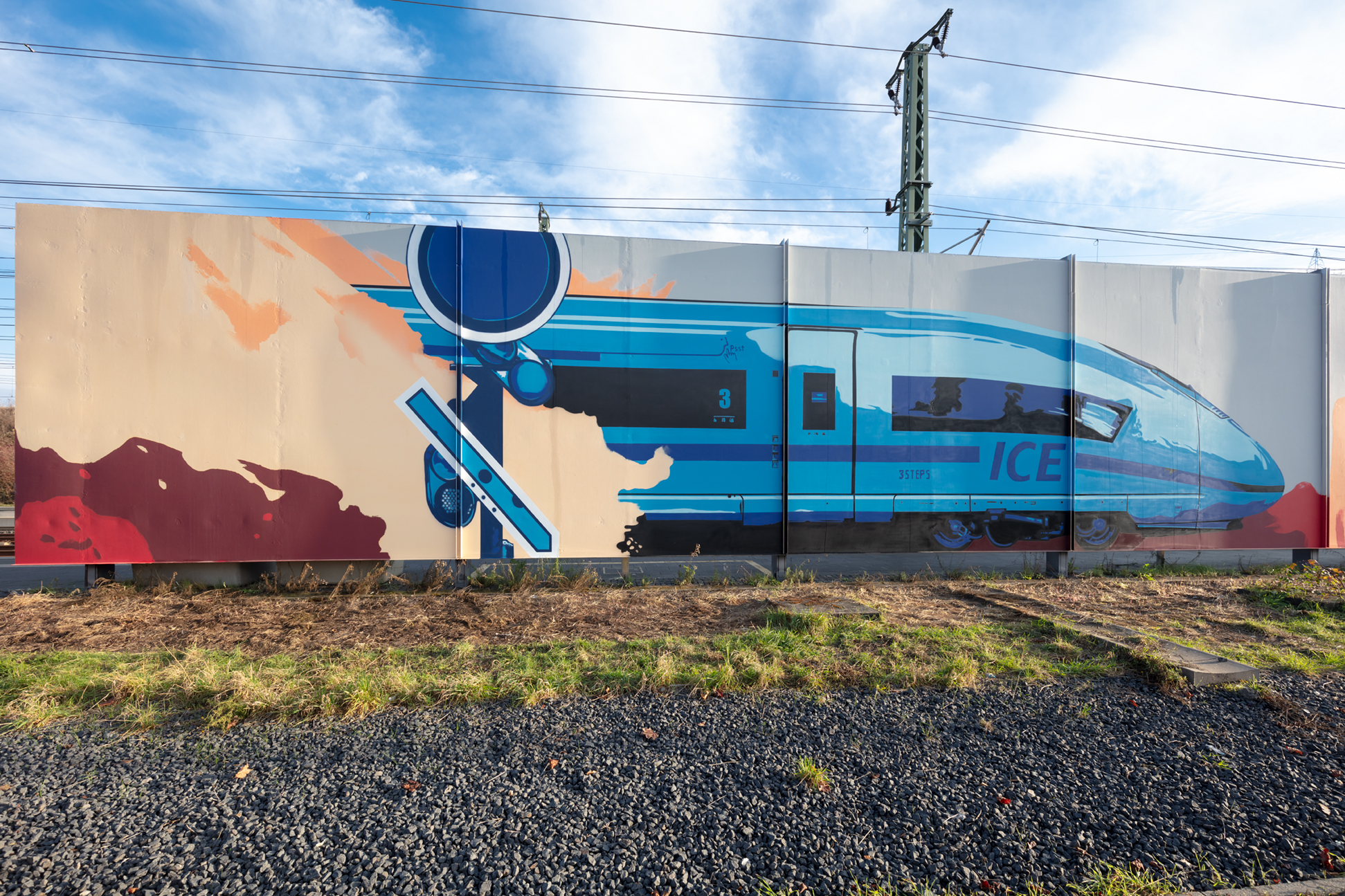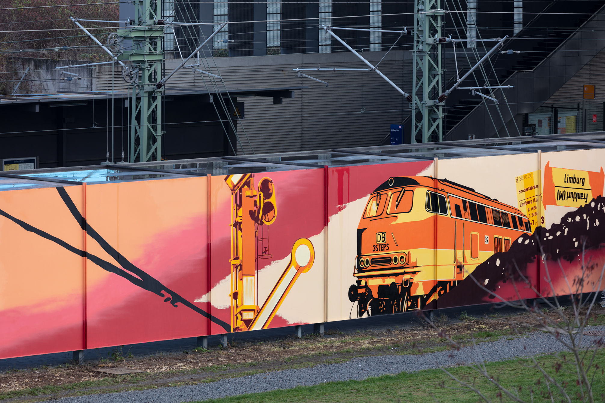 In poppigen Farben fährt von der linken Seite ein ICE-3 in das Bild, von rechts eine alte Diesellok – und in der Mitte ist eine Collage mit einer historischen Dampflok aus dem Lahntal und Motiven aus Limburg zu sehen: Seit kurzem können Reisende am Bahnhof dieses neue Kunstwerk bestaunen. Im Auftrag der Deutschen Bahn hat das hessische Künstlerkollektiv 3Steps ein einzigartiges Gemälde auf 460 Quadratmeter Stahl am ICE Bahnhof Limburg Süd gestaltet – mit dem Ziel, den Bahnhof noch attraktiver zu gestalten. „Wir wollten hier bewusst den Blick zurück werfen auf die Historie der Eisenbahn“, so Carsten Hoepfner, Leiter des Bahnhofsmanagements. „Der Eisenbahn gehört aber auch die Zukunft – deshalb haben wir noch den ICE in das Bild integriert. Das Ergebnis übertrifft alle meine Erwartungen. Ich freue mich, dass wir den Bahnhof auf diese Weise verschönern konnten.“