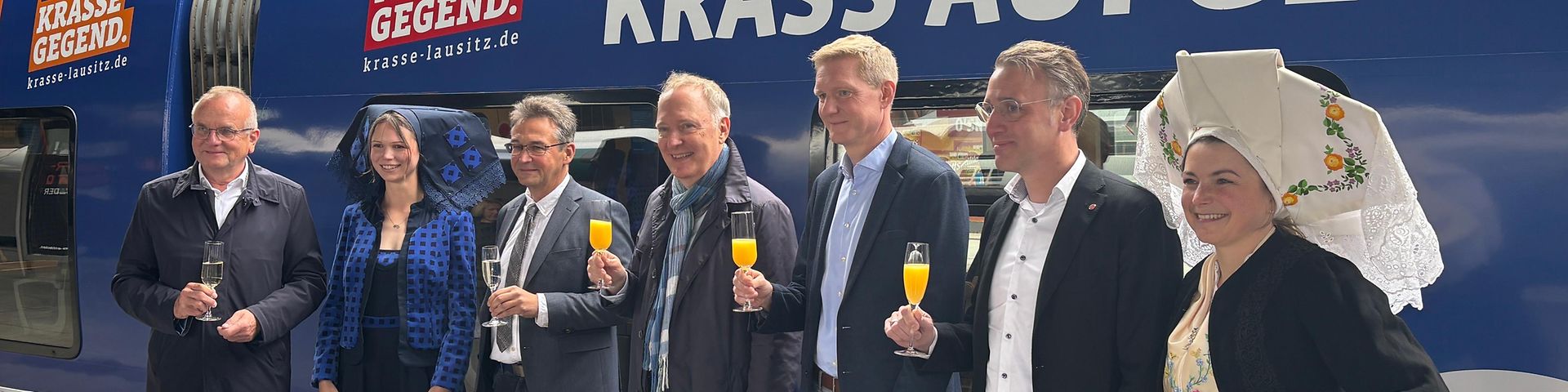Ein Regionalzug im markanten Design der Imagekampagne „Die Lausitz. Krasse Gegend.“ ist ab sofort auf der Linie RE7 zwischen Dessau und Senftenberg im Einsatz. Am Montag wurde das Fahrzeug am Berliner Bahnhof Friedrichstraße offiziell vorgestellt – mit dabei Infrastrukturminister Detlef Tabbert, der Lausitz-Beauftragte der Staatskanzlei, Dr. Klaus Freytag, sowie Alexander Kaczmarek und Carsten Moll von der Deutschen Bahn.