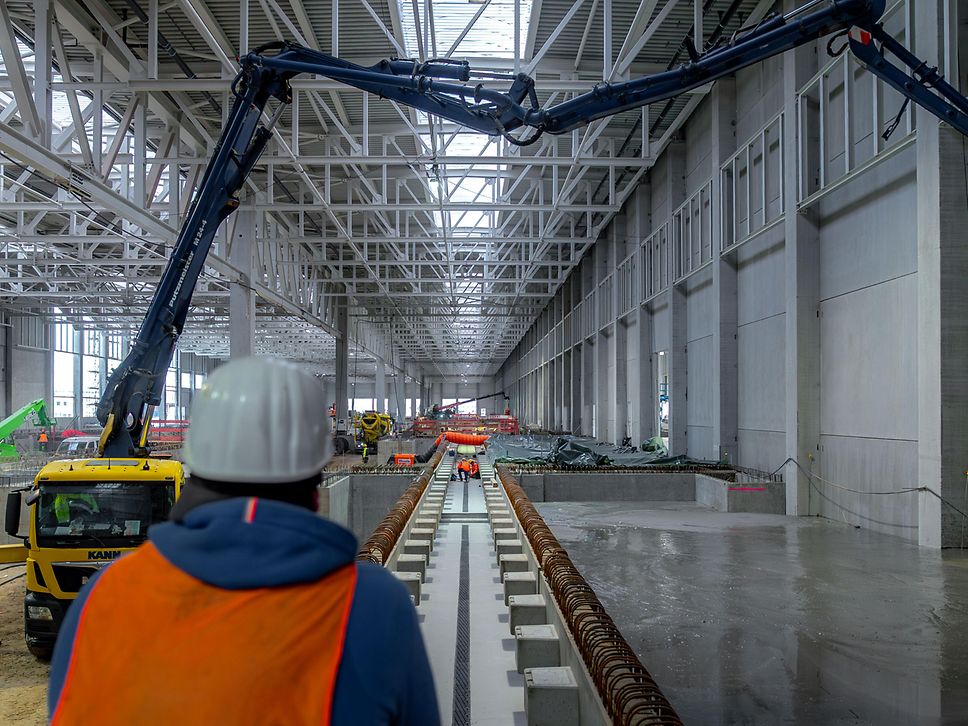 In den Nebenwerkstätten, in denen beispielsweise Klimaanlagen und Drehgestelle aufgearbeitet werden, laufen die letzten Arbeiten am Rohbau und die Installation der Ausstattung hat begonnen. Im Sozial- und Bürogebäude sind alle Fenster eingesetzt und die Decke betoniert. Auch hier schreiten die Arbeiten am Innenausbau voran. In der ganzen Halle 1 sind die Montagearbeiten für Heizung, Lüftung und Sanitär im vollen Gange.