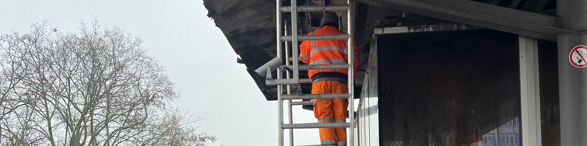 In der Neujahrsnacht war der Bahnsteig des S-Bahnhofs durch mutmaßliche Brandstiftung stark beschädigt worden. Das Bahnsteigdach, das ehemalige Aufsichtsgebäude, Beleuchtungs-, Beschallungs- sowie weitere elektrische und telekommunikative Anlagen wurden zum Teil zerstört. Die Schäden sind immens, die Kosten mit kalkulierten 300.000 Euro sehr hoch.