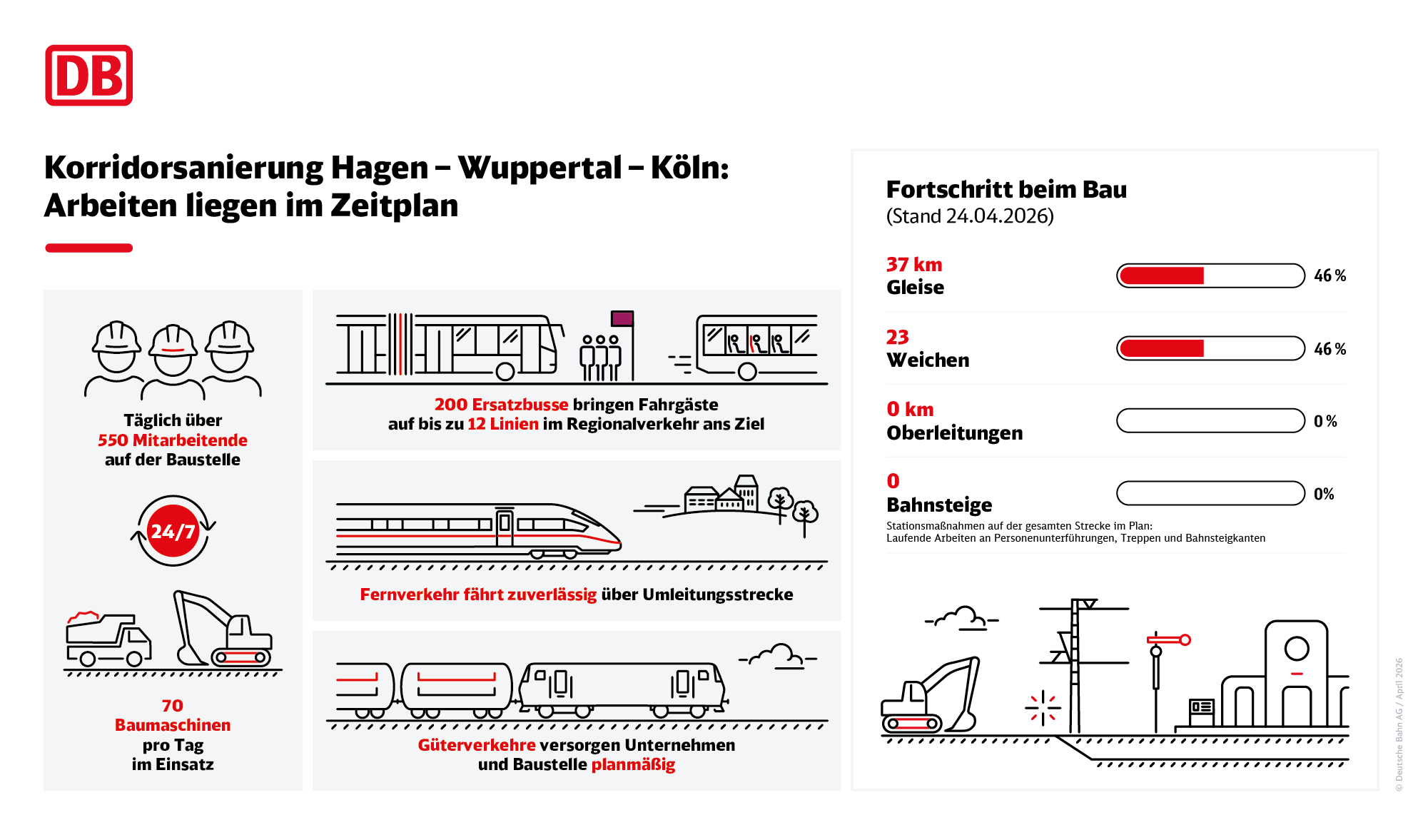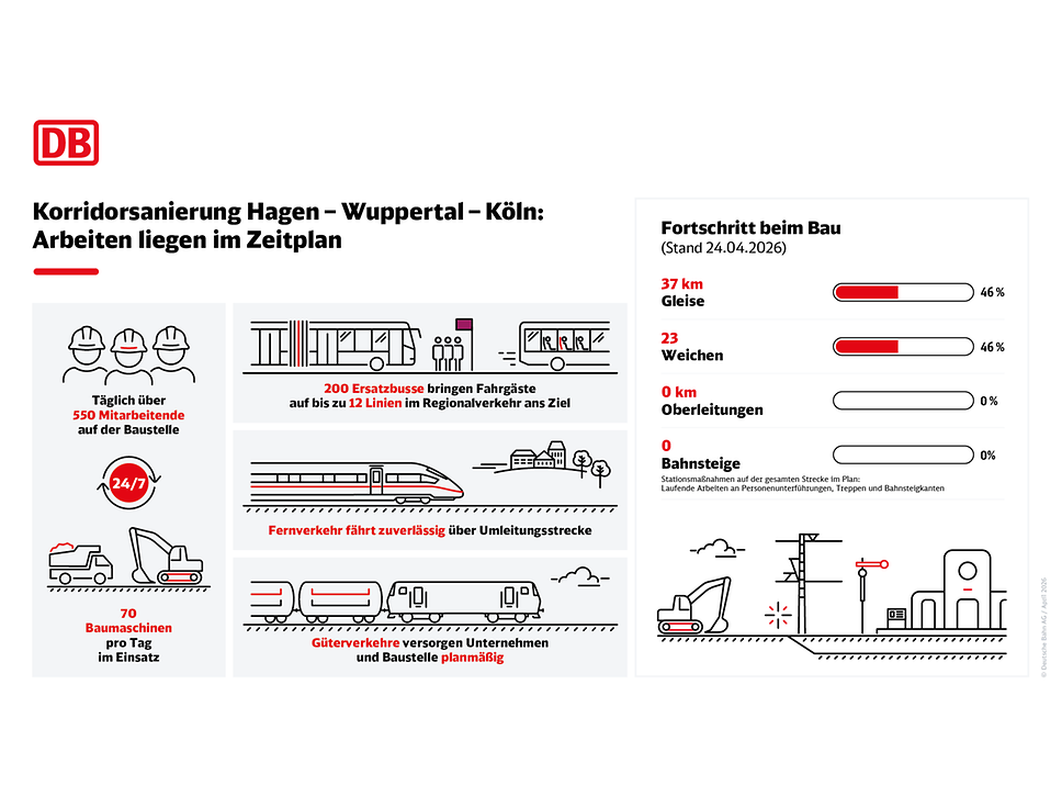 Wichtiger Meilenstein bei der Korridorsanierung zwischen Hagen, Wuppertal und Köln: Die DB InfraGO hat die Hälfte der Bauzeit erfolgreich absolviert. Seit dem Baustart am 6. Februar 2026 haben die Bauteams bereits knapp 37 Kilometer Gleis und 23 Weichen erneuert. Mit Hilfe eines 800 Meter langen Bauzugs wurde zudem auf über 35 Kilometern das Gleisbett gereinigt oder ausgetauscht. Darüber hinaus haben die Teams auf über 400 Metern neue Schallschutzwände gebaut. Auch an den zwölf Stationen kommen die Arbeiten planmäßig voran: Die Abrissarbeiten konnten die Teams im letzten Monat an allen Bahnhöfen nahezu abschließen. Zudem sind die Neubauarbeiten im vollen Gange: An vielen Stationen sind die neuen Bahnsteigkanten sowie die Fundamente für neue Dächer und Aufzüge bereits gesetzt. Somit liegt die DB InfraGO mit den Sanierungsarbeiten zwischen Ruhrgebiet, Bergischem Land und Rheinland weiter im Plan.