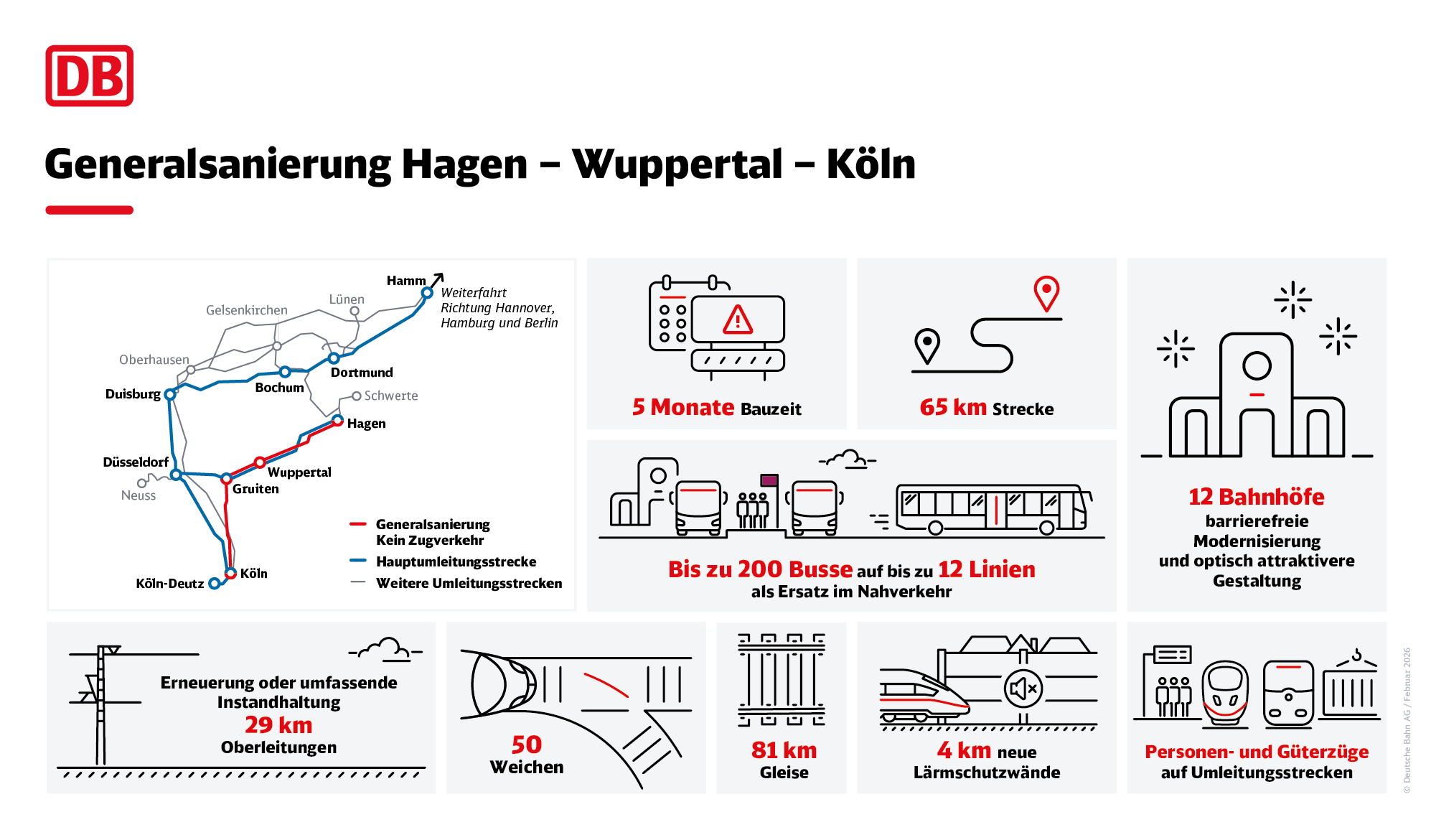 Während der Zeit der Generalsanierung zwischen Februar und Juli 2026 erneuert die DB InfraGO zwischen Ruhrgebiet, Bergischem Land und Rheinland 81 Kilometer Gleis, 50 Weichen sowie 29 Kilometer der Oberleitung oder setzt sie umfassend instand. Zusätzlich bauen die Teams knapp vier Kilometer neue Schallschutzwände entlang der Strecke, sodass es für Anwohnende zukünftig deutlich leiser wird.