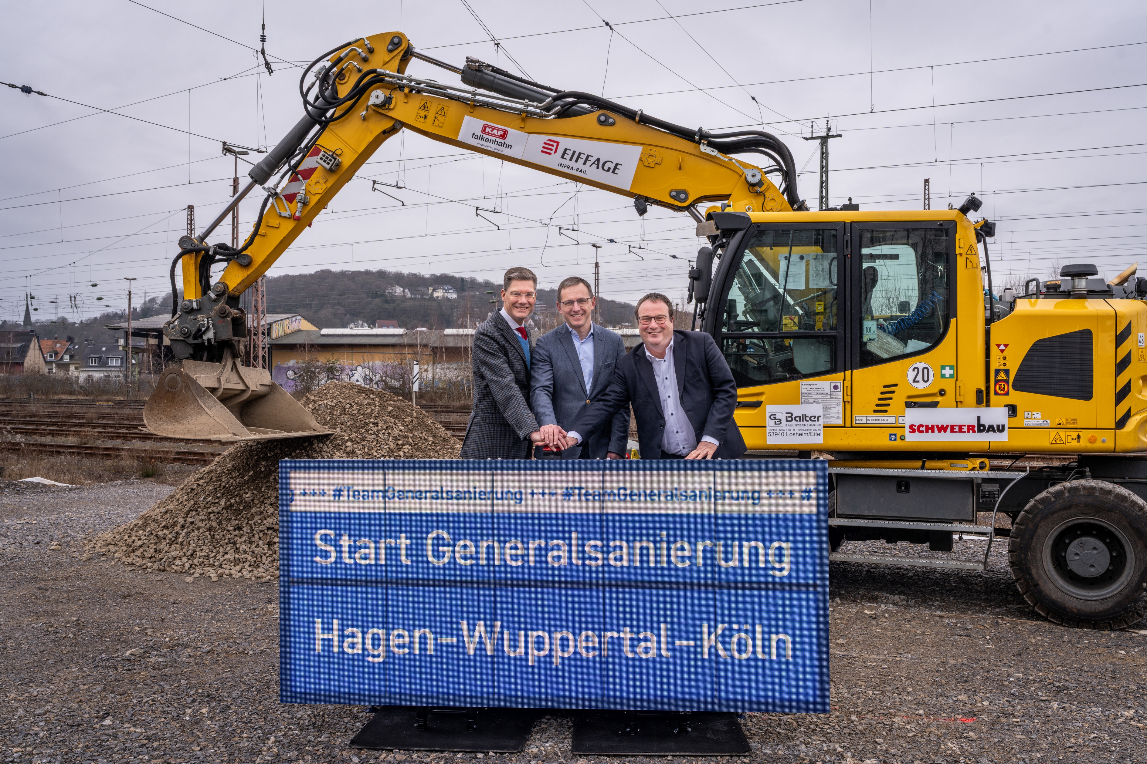 Die DB InfraGO startet mit der Generalsanierung des wichtigen Bahnkorridors zwischen Hagen, Wuppertal und Köln. Dr. Philipp Nagl, Vorstandsvorsitzender der DB InfraGO, Christian Hirte, Parlamentarischer Staatssekretär beim Bundesministerium für Verkehr, und Oliver Krischer, Minister für Umwelt, Naturschutz und Verkehr des Landes Nordrhein-Westfalen, haben heute Nachmittag in Wuppertal-Elberfeld auf einer der zahlreichen Baustelleneinrichtungsflächen das offizielle Startsignal gegeben. Parallel beginnt heute auch die Generalsanierung auf der Strecke zwischen Nürnberg und Regensburg.