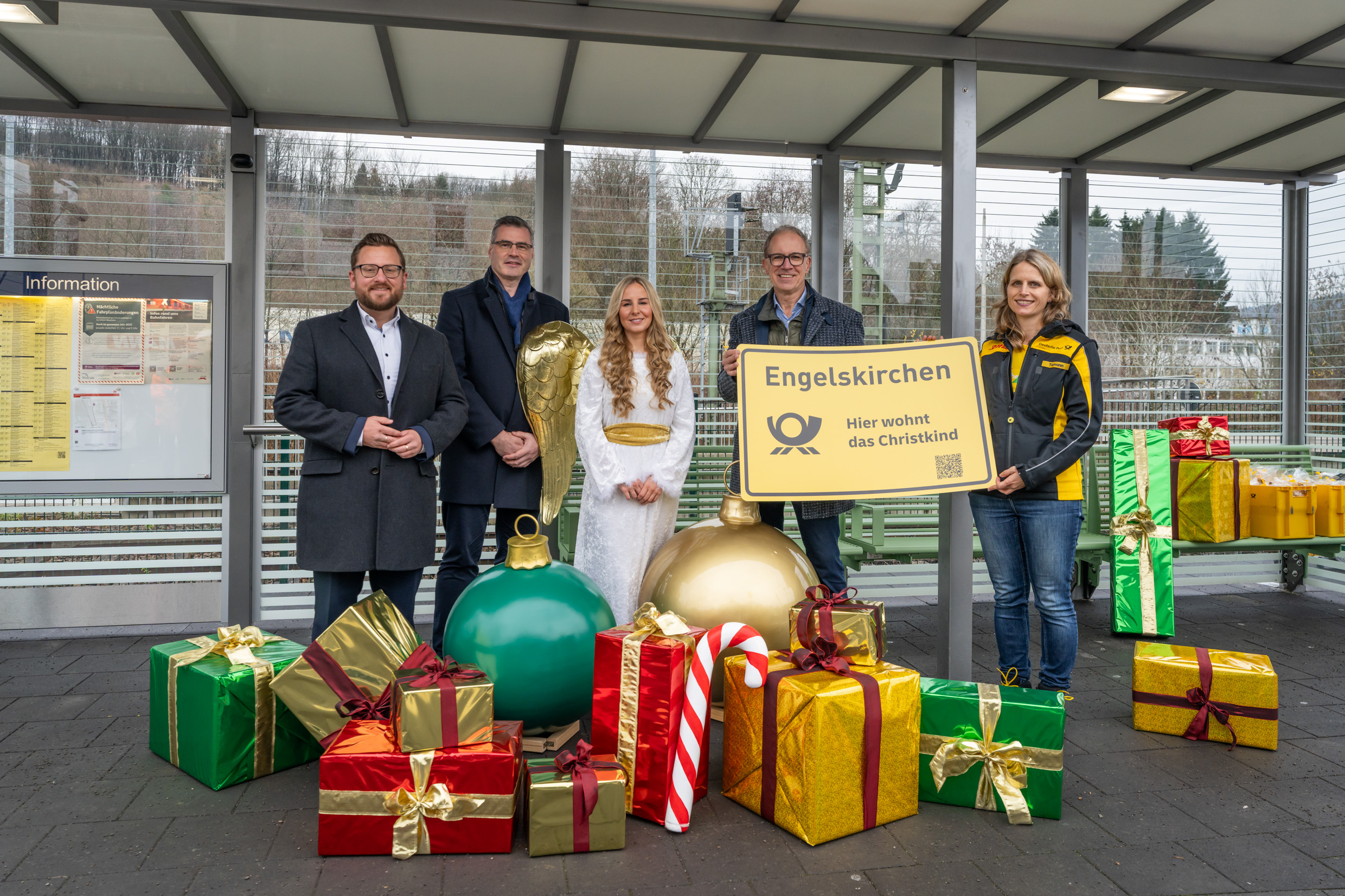 (v.l.n.r.) Lukas Miebach, Bürgermeister der Gemeinde Engelskirchen; Michael Hundacker, stellvertretender Bahnhofsmanager der DB InfraGO für den Raum Köln/Bonn; das Christkind; Dr. Norbert Reinkober, Geschäftsführer go.Rheinland; Juliane Tiemann, DHL Group, Niederlassungsleiterin Post & Paket Deutschland