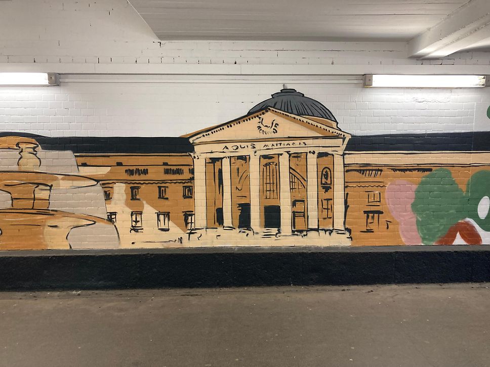Das Wiesbadener Stadtschloss, der Pavillon auf dem Neroberg, das Staatstheater oder der Hauptbahnhof - wer durch die Personenunterführung an der S-Bahn-Station Wiesbaden-Ost geht, den empfangen dort seit ein paar Tagen großformatige Illustrationen wichtiger Wahrzeichen der hessischen Landeshauptstadt. Der Wiesbadener Künstler Manuel Gerullis und das Künstlerkolletkiv Buntic Media haben den rund 70 Meter langen Personentunnel an der Station im Auftrag der Deutschen Bahn (DB) mit den Motiven versehen. Auch der Rest der Wände erhielt einen komplett neuen Anstrich.