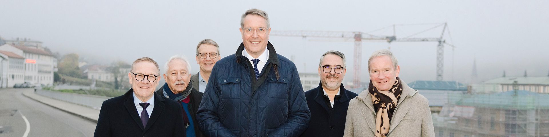 Auf dem Titel-Foto, v.l.n.r.: Stefan Schwinn, Leiter Personenbahnhöfe DB Region Mitte, Werner Schreiner, Beauftragter für grenzüberschreitende Zusammenarbeit der Staatskanzlei Rheinland-Pfalz, Bernhard Adams, Beigeordneter für Bau- und Verkehrsangelegenheiten der Stadt Neustadt a. d. Weinstraße,, Alexander Schweitzer, Ministerpräsident des Landes Rheinland-Pfalz, Marc Weigel, Oberbürgermeister der Stadt Neustadt a. d. Weinstraße und Hans Sachs, Immobilien-Projektentwickler