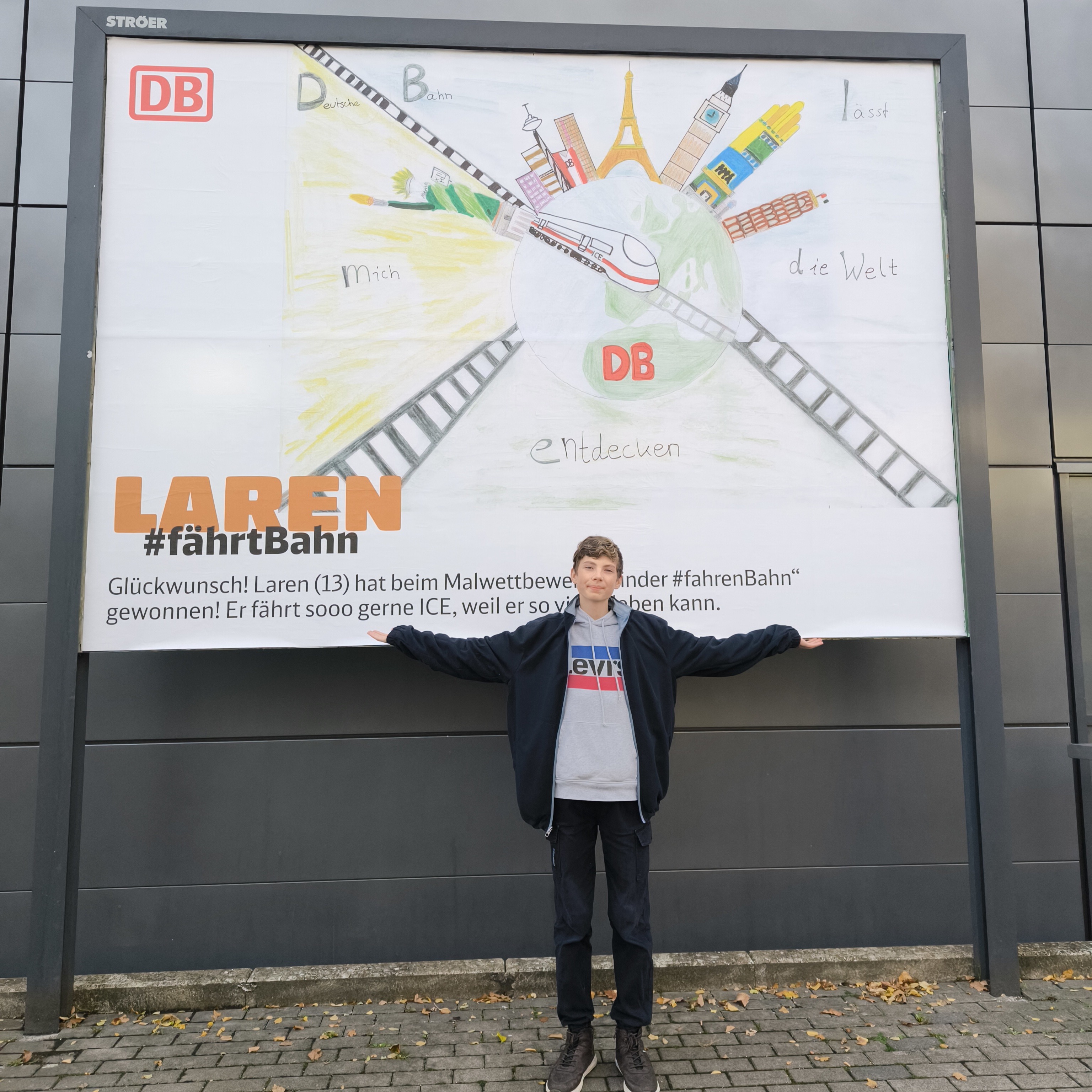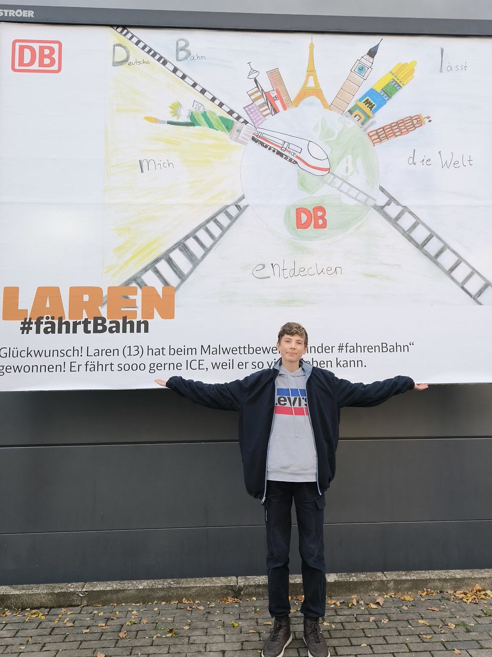 Neben der Bahn hat es Laren auch die Kunst angetan. Er zeichnet viel, besucht Kunstkurse und entdeckt gerne Museen. Als er von der Aktion „Kinder #fahrenBahn“ hörte, war er sofort begeistert. Seine künstlerische Ader und sein Entdeckergeist zeigen sich dann auch im eingereichten Bild. Hier hat der 13-jährige mehrere Sehenswürdigkeiten aus aller Welt gezeichnet, die er bereits besucht hat oder noch bereisen möchte. Verbunden werden Sie – natürlich – durch einen ICE. Großes Lob gibt es auch für das Zugpersonal: „Die Zugbegleiter:innen sind immer sehr freundlich zu mir“, so Laren, der dem nächsten großen Ziel bereits entgegenfiebert. Seine nächste Reise mit der DB geht nach Berlin.