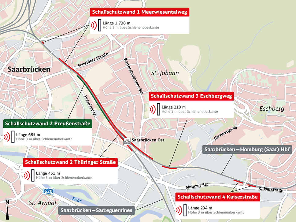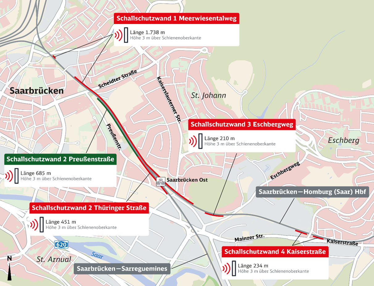Die Deutsche Bahn (DB InfraGo) baut in den kommenden Jahren Schallschutzwände mit einer Gesamtlänge von rund 20 Kilometern in Saarbrücken. Davon befinden sich derzeit neun Wände mit einer Höhe von drei Metern und einer Gesamtlänge von rund 8.000 Metern in Saarbrücken Ost im Bau. Durch die Lärmsanierungsmaßnahmen werden die Anwohner:innen in rund 4.500 Wohneinheiten entlang der Strecke vom Lärm der vorbeifahrenden Züge spürbar entlastet. Die Schallschutzmaßnahmen sind Teil des Programms „Lärmsanierung an bestehenden Schienenwegen der Eisenbahnen des Bundes“. Der Bund investiert in Saarbrücken Ost insgesamt rund 23,1 Millionen Euro in aktive Schallschutzmaßnahmen, um die Lärmbelästigungen zu reduzieren.