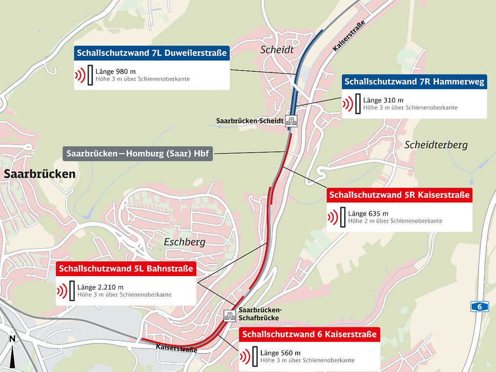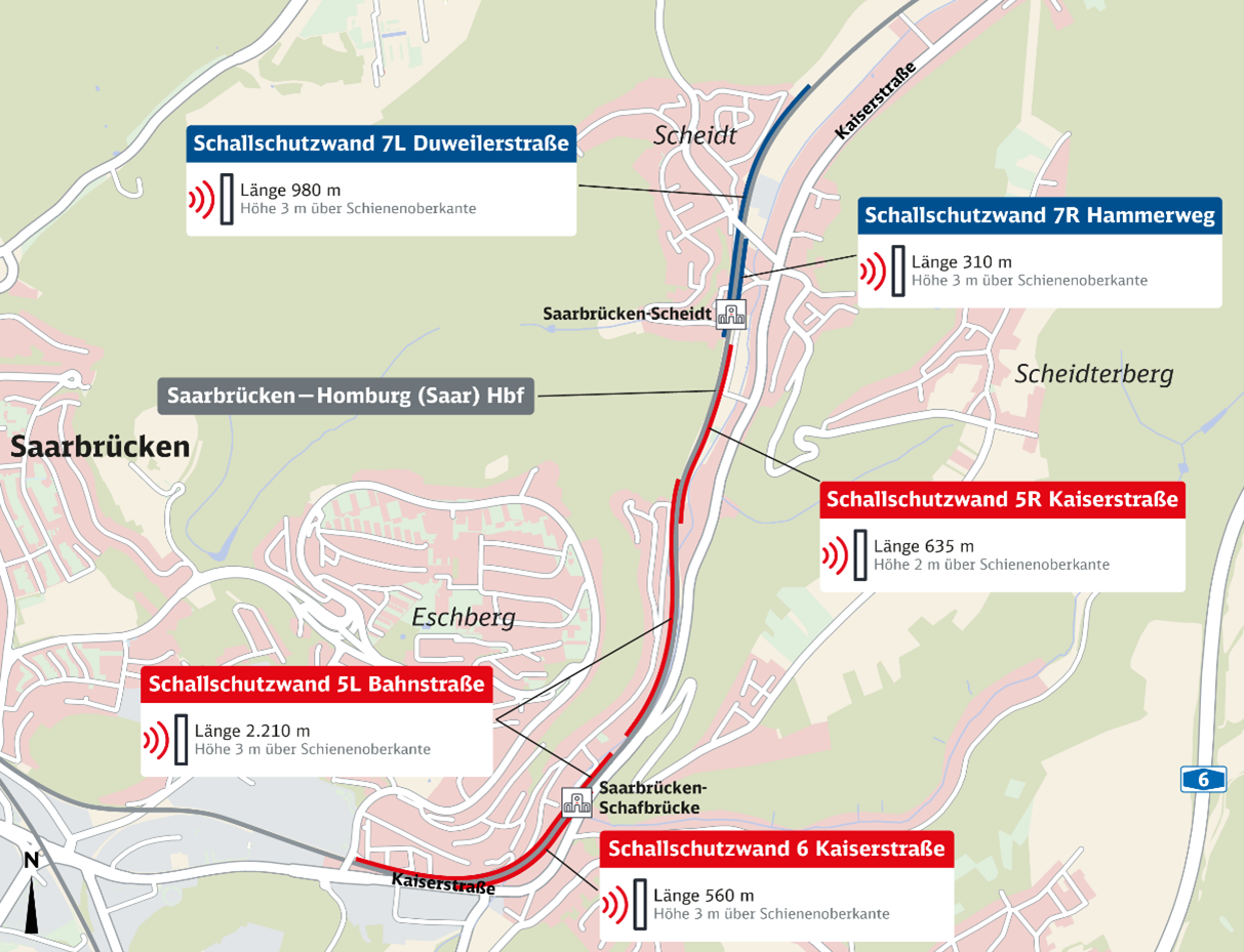 Maßnahme: | Länge der Schallschutzwände (SSW): 8.013 Meter Wandhöhe: 3 m über SchienenoberkanteSSW 1: Meerwiesentalweg, Länge 1.738 m SSW 2: Preußenstraße, Länge 685 m SSW 2: Thüringer Straße, Länge 451 m SSW 3: Eschbergweg, Länge 210 m SSW 4: Kaiserstraße, Länge 234 m SSW 5L: Bahnstraße, Länge 2.210 m SSW 5R: Kaiserstraße, Länge 635 m SSW 6: Kaiserstraße, Länge 560 m SSW 7L: Dudweilerstraße, Länge 980 m SSW 7R: Hammerweg bis Im Wiesental, Länge 310 m |