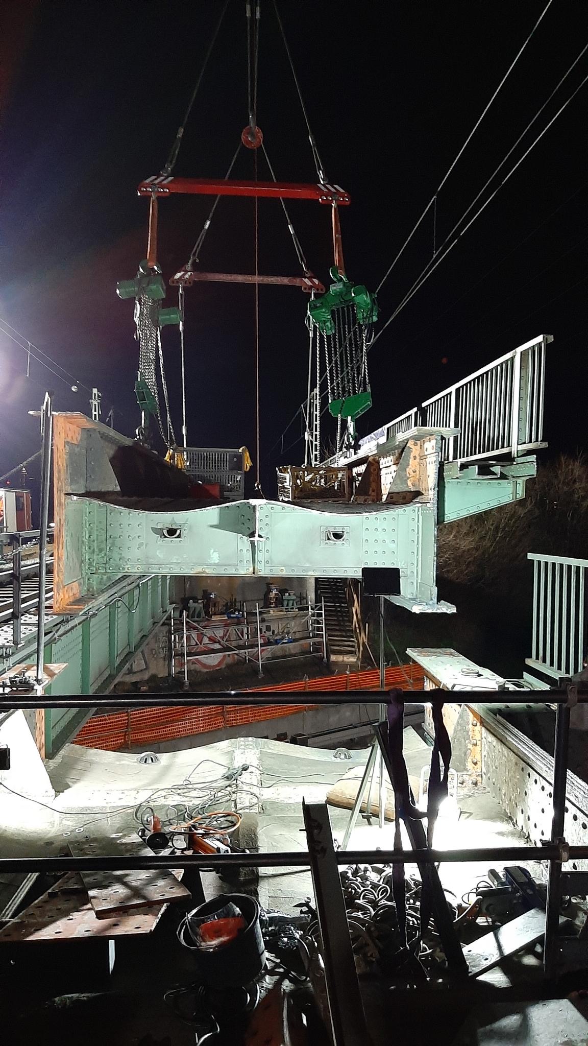 Bis zu 60 Spezialist:innen von DB und beauftragten Firmen sind am Wochenende an der genieteten Stahlbrücke im Einsatz. Am Samstag trennen die Bauteams zunächst den reparaturbedürftigen Bereich vom restlichen Bauwerk. Anschließend hebt ein 700-Tonnen-Kran diesen aus seiner bisherigen Position und setzt ihn auf einem Schwerlasttransporter ab. Am Sonntag macht sich der Transporter dann auf den Weg nach Koblenz, wo Spezialist:innen das über 50 Tonnen schwere Brückenteil rundum instand setzen. Zwischen dem 20. und 22. Mai baut die DB das reparierte Stahlmodul zurück an Ort und Stelle ein. Im letzten Schritt stellen die Bauteams den Oberbau mit Schienen, Schwellen und Schotter wieder her und führen einige Nacharbeiten durch. Ab dem 30. Mai können die Züge dann in gewohnter Weise über die Stahlbrücke fahren.