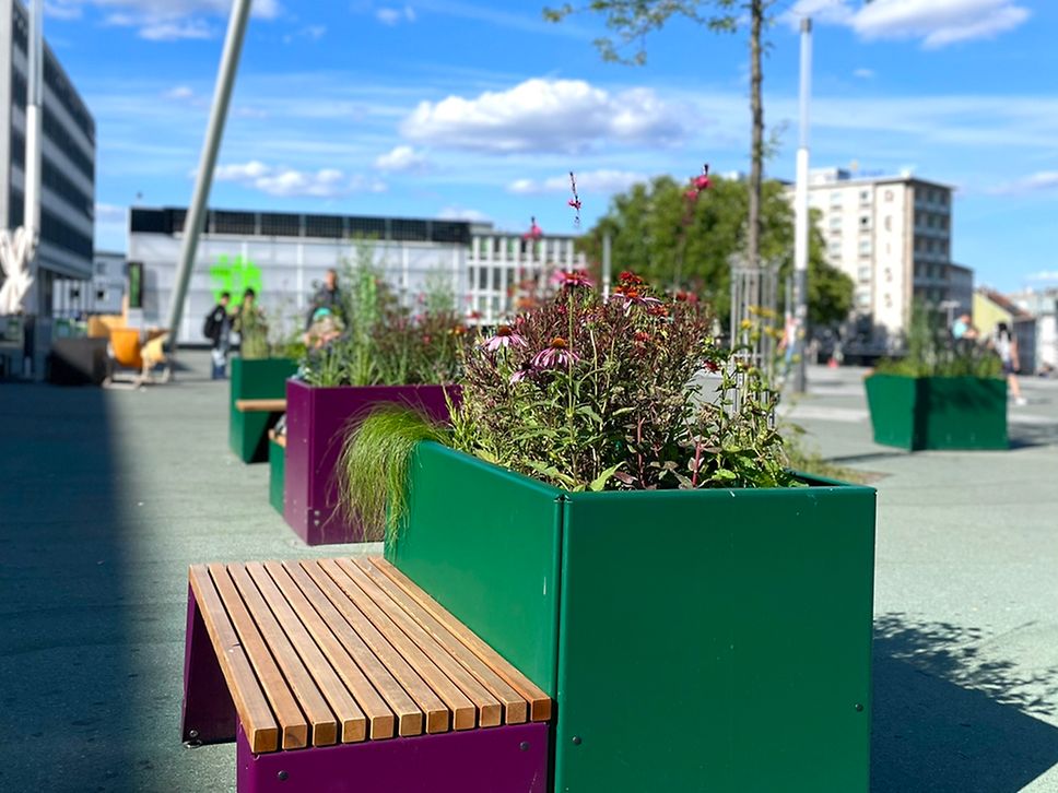 Der Vorplatz des Kasseler Hauptbahnhofs ist kein unbeschriebenes Blatt: Der rumänische Künstler Dan Perjovschi hat dieses Jahr für die documenta fifteen zum Pinsel gegriffen und hier Bodenflächen gestaltet. Die farbigen Sitzinseln, die die DB auf dem Platz aufgestellt hat, erfreuen ebenfalls das Auge und bieten zusätzlich Raum zum Verweilen. Die Stadtmöbel aus Metall und Holz mit breiten Sitzflächen und bewachsenen Pflanzenkübeln schaffen mitten in der Stadt kleine Ruhepole.