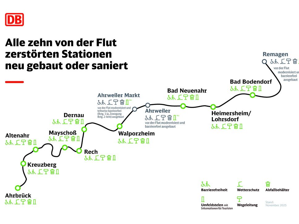In vier Wochen ist es so weit: Mitte Dezember können wieder Züge über die neue Ahrtalbahn fahren. Damit die Reisenden dann auch an modernen Stationen ein- und aussteigen können, hat die Deutsche Bahn (DB InfraGO) neben dem Wiederaufbau und der Elektrifizierung der Strecke alle zehn von der Flut zerstörten Stationen neu gebaut oder umfangreich saniert. Zudem sind die insgesamt 13 Stationen entlang der Bahnlinie von Remagen bis Ahrbrück Mitte Dezember bis auf Bahnsteig 2 in Ahrweiler-Markt vollständig barrierefrei. Dank weiterer Verbesserungen wie Wetterschutzhäusern, moderner dynamischer Schriftanzeiger und neuer Wegeleitung profitieren die Kundinnen und Kunden ab Fahrplanwechsel insgesamt von höherem Komfort und mehr Aufenthaltsqualität. Der Zugang zur klimafreundlichen Schiene wird so an der Ahrtalbahn noch einfacher und besser möglich.