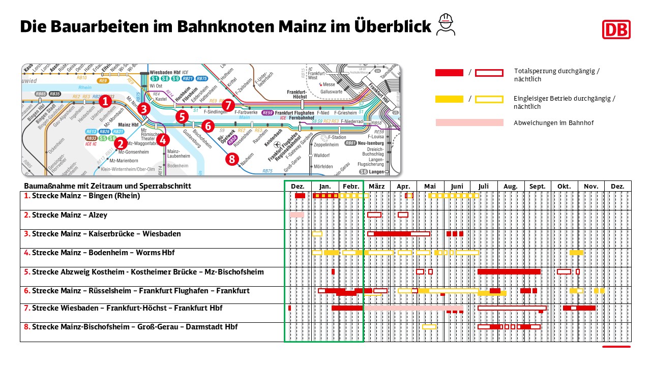 Auf der Strecke Heidelberg–Bensheim–Darmstadt–Frankfurt fahren die Fernverkehrszüge statt bisher im Stundentakt übergangsweise für ein Jahr zeitlich versetzt um 30 bzw. 90 Minuten. Dafür kommen künftig ausschließlich ICE-Züge zum Einsatz statt vormals auch einzelne ältere IC/EC-Züge.
