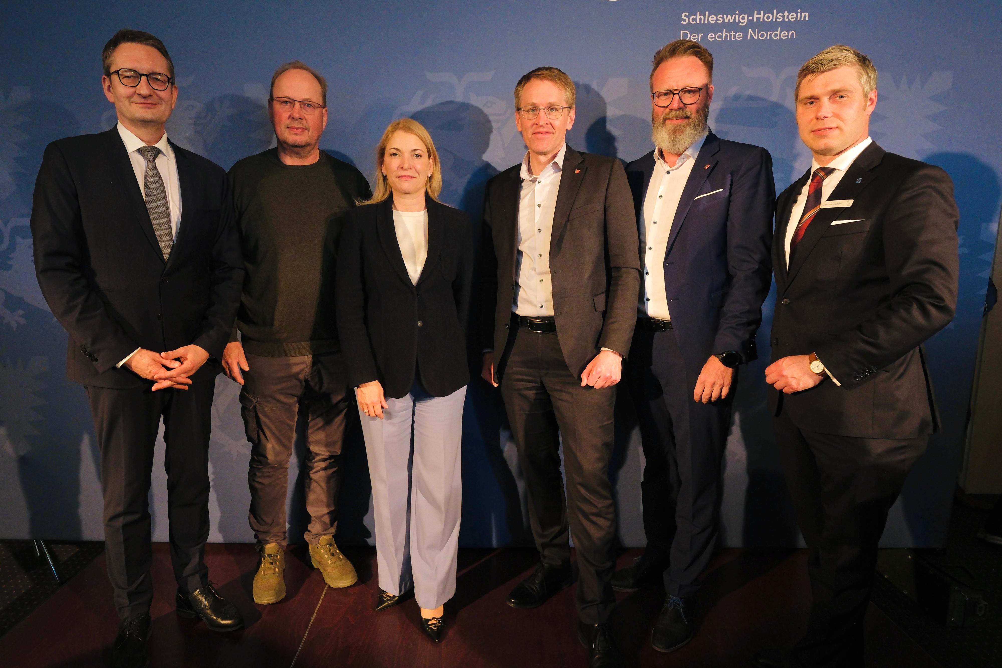 v. li. nach re.: Stefan Schnorr, Achim Bonnichsen, Evelyn Palla, Daniel Günther, Claus Ruhe Madsen, Florian Lorenzen