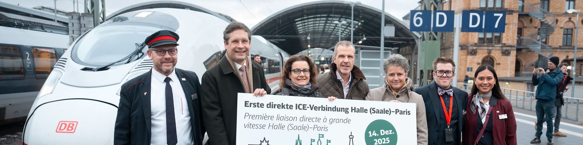 Der erste ICE nonstop nach Paris wurde heute Morgen am Hauptbahnhof Halle feierlich begrüßt – und mit neuen Reisenden aus der Saale-Stadt an Bord verabschiedet. Im Zug hat ein deutsch-französisches Team die Kundinnen und Kunden betreut.