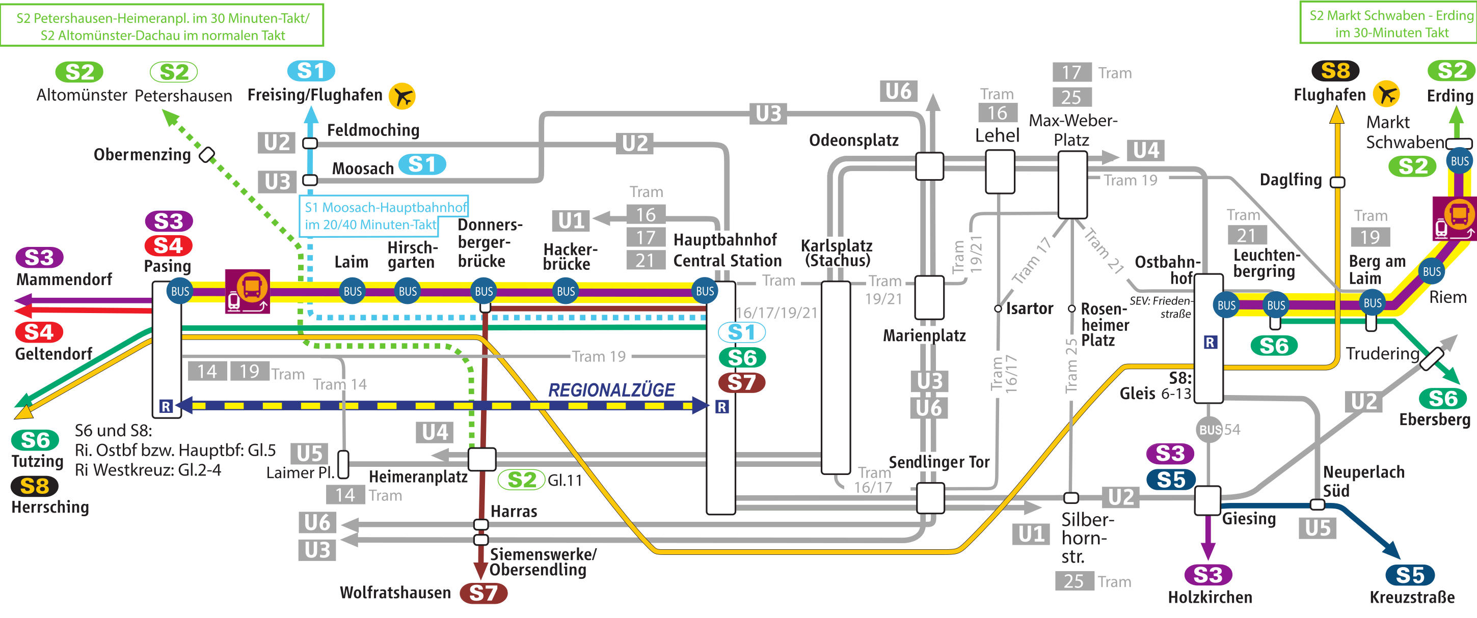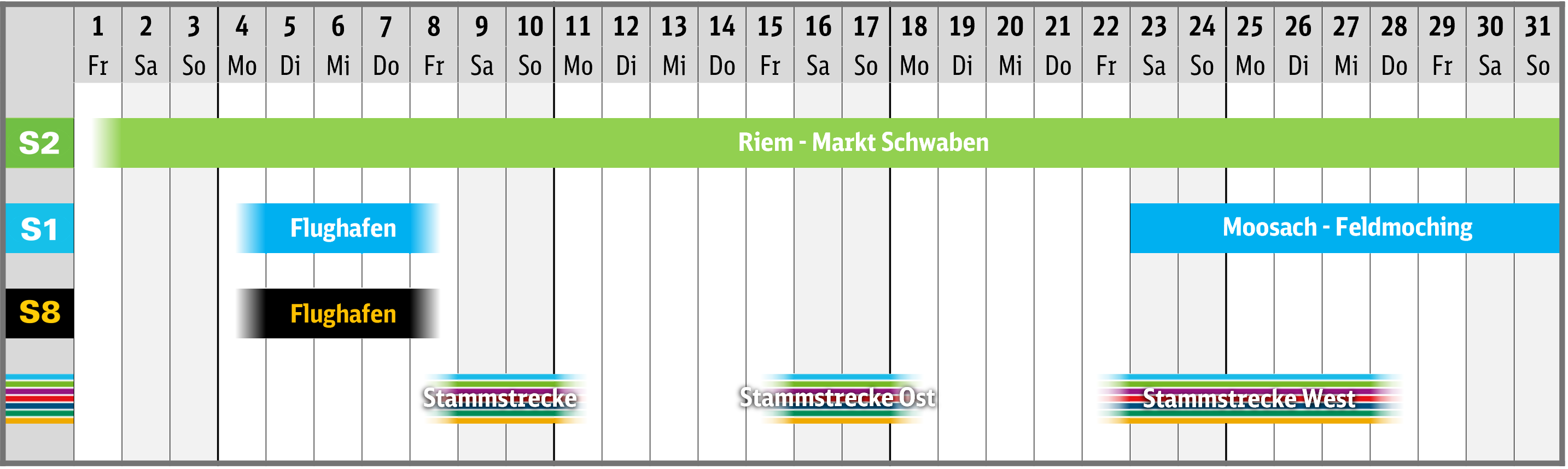 Im Mai müssen sich Fahrgäste der S-Bahn München sowie einiger Regionalverkehrslinien auf größere Fahrplanänderungen einstellen. Grund sind umfangreiche Bauarbeiten für die Instandhaltung und den Ausbau der Infrastruktur. Betroffen sind neben der Stammstrecke die Außenäste der Linien S1 Freising/Flughafen, S2 Erding und S8 Flughafen sowie Regionalzüge aus/in Richtung Landshut und Mühldorf. Die jeweils schnellste Verbindung ans Ziel finden Reisende mit der Fahrplanauskunft in den Apps, im Internet oder am Automaten. Dort sind alle Fahrplanänderungen und die Fahrzeiten der Ersatzbusse enthalten.