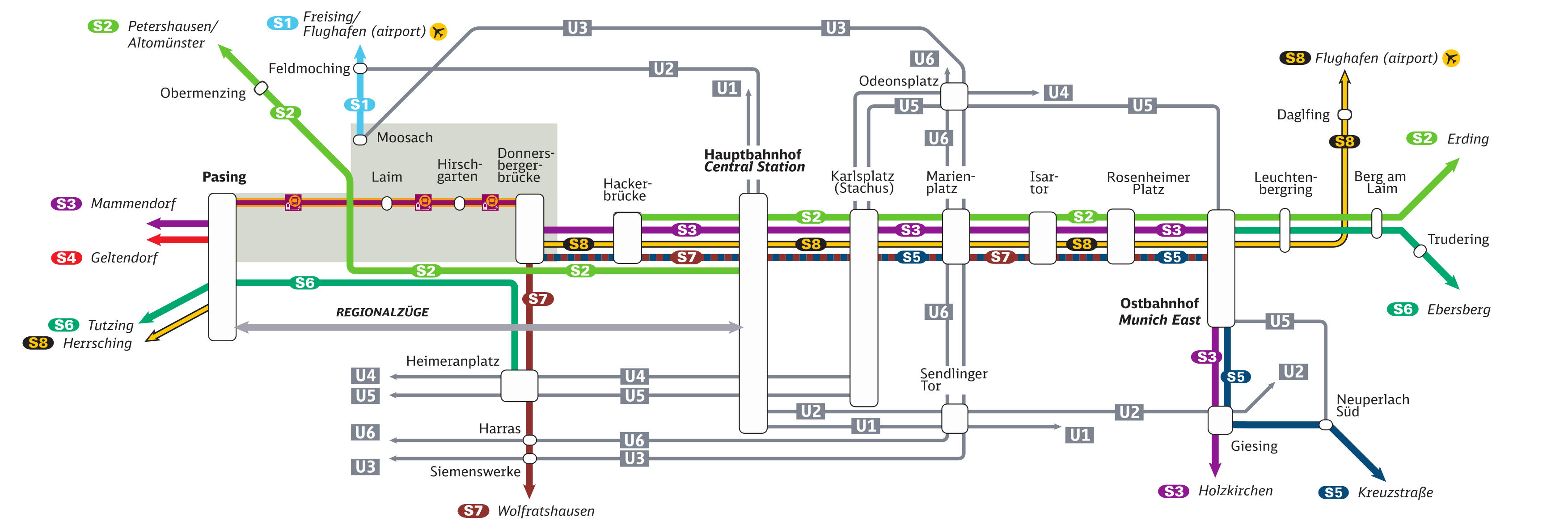 - S8: Fährt nur zwischen Herrsching und Pasing sowie zwischen Donnersbergerbrücke und Flughafen.