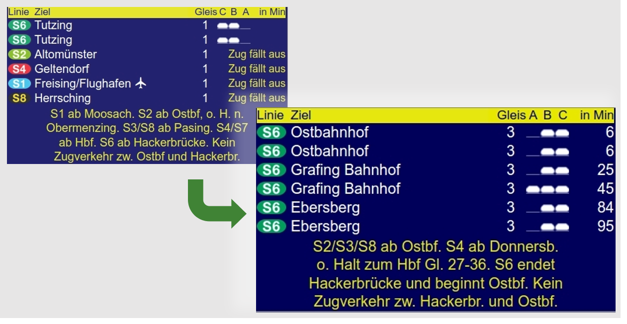 Neues gibt es auch an den Stationen: Alle Stationen werden mit Informationsmonitoren zur Anzeige der nächsten Abfahrten ausgerüstet. Nach und nach werden zudem ältere Informationsmonitore durch neue Anzeiger-Generationen ersetzt. Die modernen Farbdisplays bieten eine höhere Auflösung und können mehr Abfahrten anzeigen als ihre Vorgänger. Die Umrüstung auf der Stammstrecke startet in diesen Tagen, auch außerhalb der Tunnelbahnhöfe wurden die ersten Anzeigen bereits erneuert. Um den verfügbaren Platz auf den Anzeigern besser zu nutzen, setzen die S-Bahn und die DB Station&Service AG auf der Stammstrecke zudem einen oft geäußerten Wunsch der Fahrgäste um. Bei größeren Störungen liegt der Fokus ab sofort ganz auf relevanten Informationen: Neben Fließtexten, die wie bisher über geänderte Linienverläufe informieren, beschränkt sich die Anzeige der nächsten Abfahrten auf fahrende Züge – Ausfälle werden nicht aufgeführt. So werden inhaltliche Doppelungen vermieden und mehr Abfahrten angezeigt. Die „Fokusinformation“ wird gezielt nur während größerer Störungen auf den Stationen der S-Bahn-Stammstrecke angewendet.