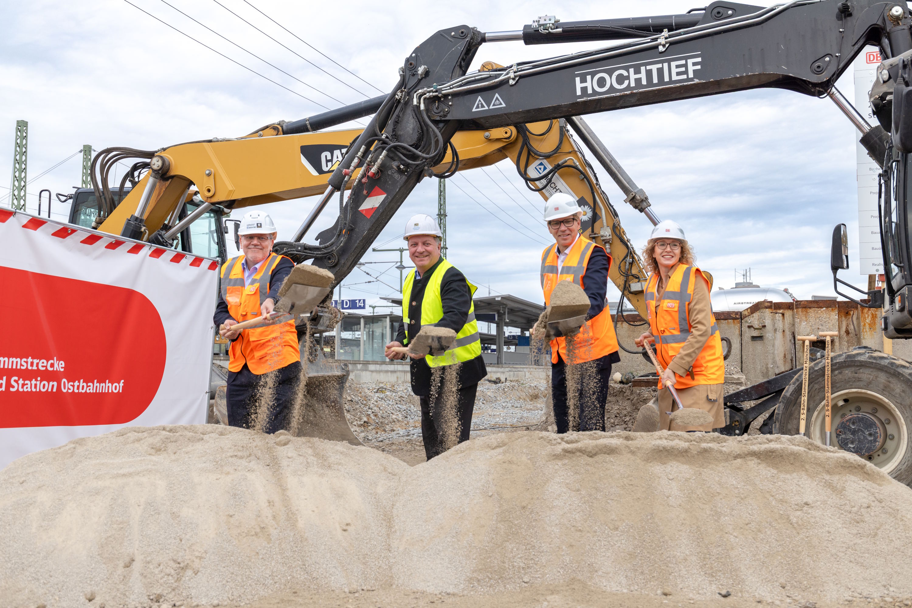 Mit einem symbolischen Spatenstich haben heute Bayerns Verkehrsminister Christian Bernreiter, Frank Abel (Bereichsleiter Europe, Hochtief) und Heike Junge-Latz (Vorständin Anlagen- und Instandhaltungsmanagement, DB InfraGO) die Arbeiten für die neue Station Ostbahnhof und die unterirdischen Rohbauten im Ostabschnitt der 2. Stammstrecke gestartet. Damit befindet sich das Projekt nun im gesamten Innenstadtbereich – von Laim bis Leuchtenbergring – in der Bauphase.