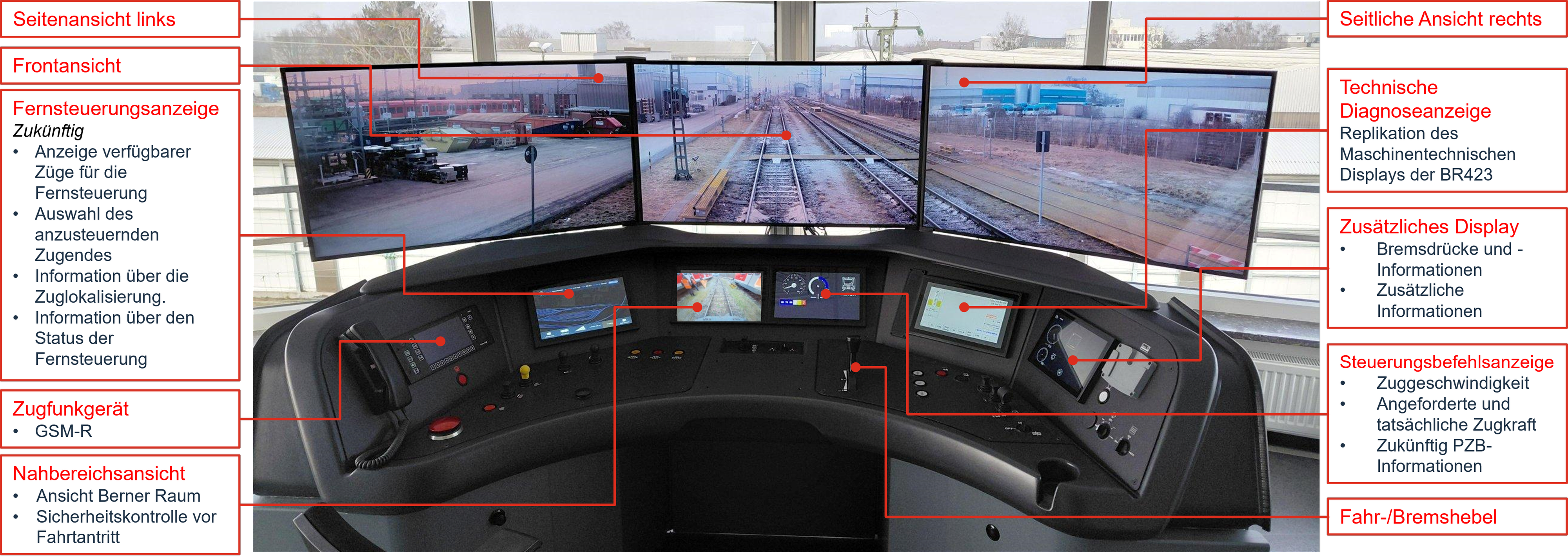 Der Testbetrieb in Steinhausen setzt mit einer umfassenden 5G-basierten Steuerung aus größerer Distanz jetzt aber neue Maßstäbe in Deutschland. Das Fahrzeug lässt sich aus der Ferne nicht nur bewegen, die Mitarbeitenden können auch Türen schließen, die Beleuchtung einschalten oder Warnsignale abgeben. Große Displays zeigen am originalgetreuen Steuerpult Livebilder der Fahrt, während der Zug draußen komplett ferngesteuert fährt. Zusätzlich ist im Rahmen des Testbetriebs eine ortsunabhängige Steuerung per Tablet möglich.