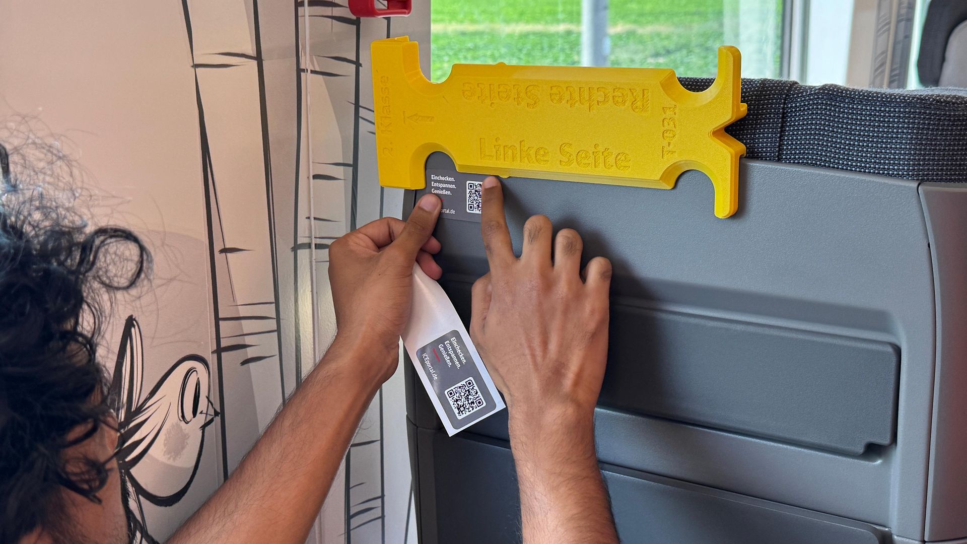 Kleines Teil, großer Effekt: Auch beim neuen ICE L kommt ein 3D-gedrucktes Hilfsmittel zum Einsatz. Eine gelbe Schablone hilft Mitarbeitenden, Piktogramme passgenau anzukleben, an denen Fahrgäste sich im Zug orientieren können – zum Beispiel die Kennzeichnung der BahnBonus-Bereiche oder die QR-Codes fürs Kundenfeedback. Mithilfe der Schablone funktioniert das Kleben deutlich schneller, einfacher und damit auch günstiger.