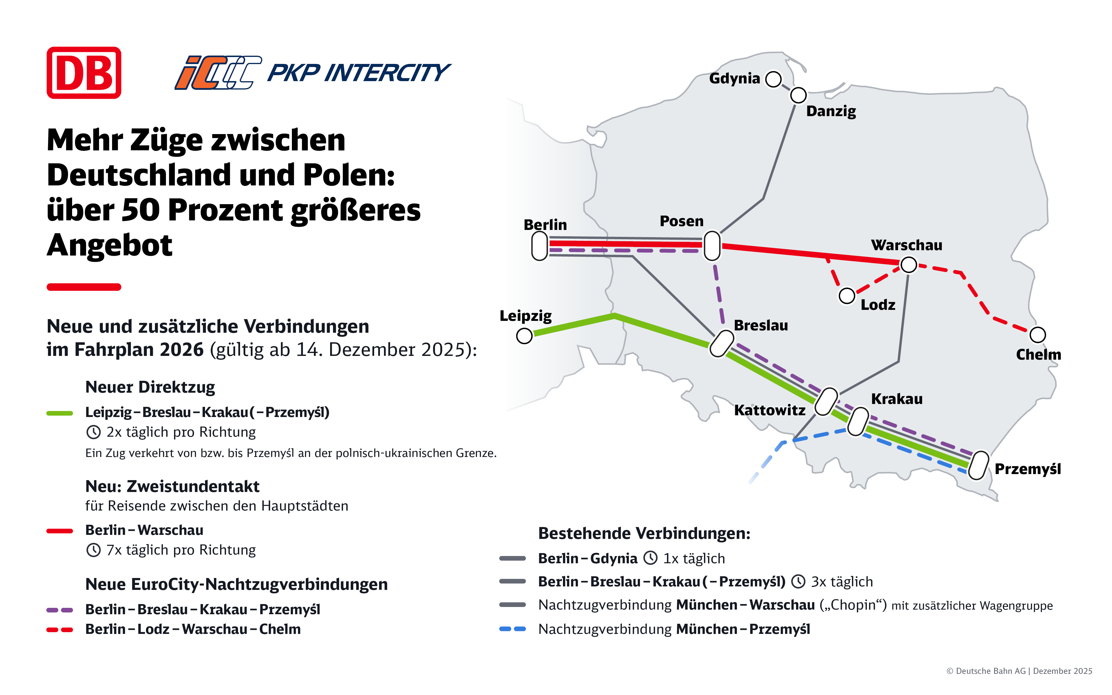 Hinweis für Redaktionen: Der erste EC-Zug Richtung Krakau wird am Sonntag, den 14. Dezember, um 14.55 Uhr feierlich am Leipziger Hauptbahnhof auf die Reise geschickt.Fotos finden Sie in der Mediathek der Deutschen Bahn.