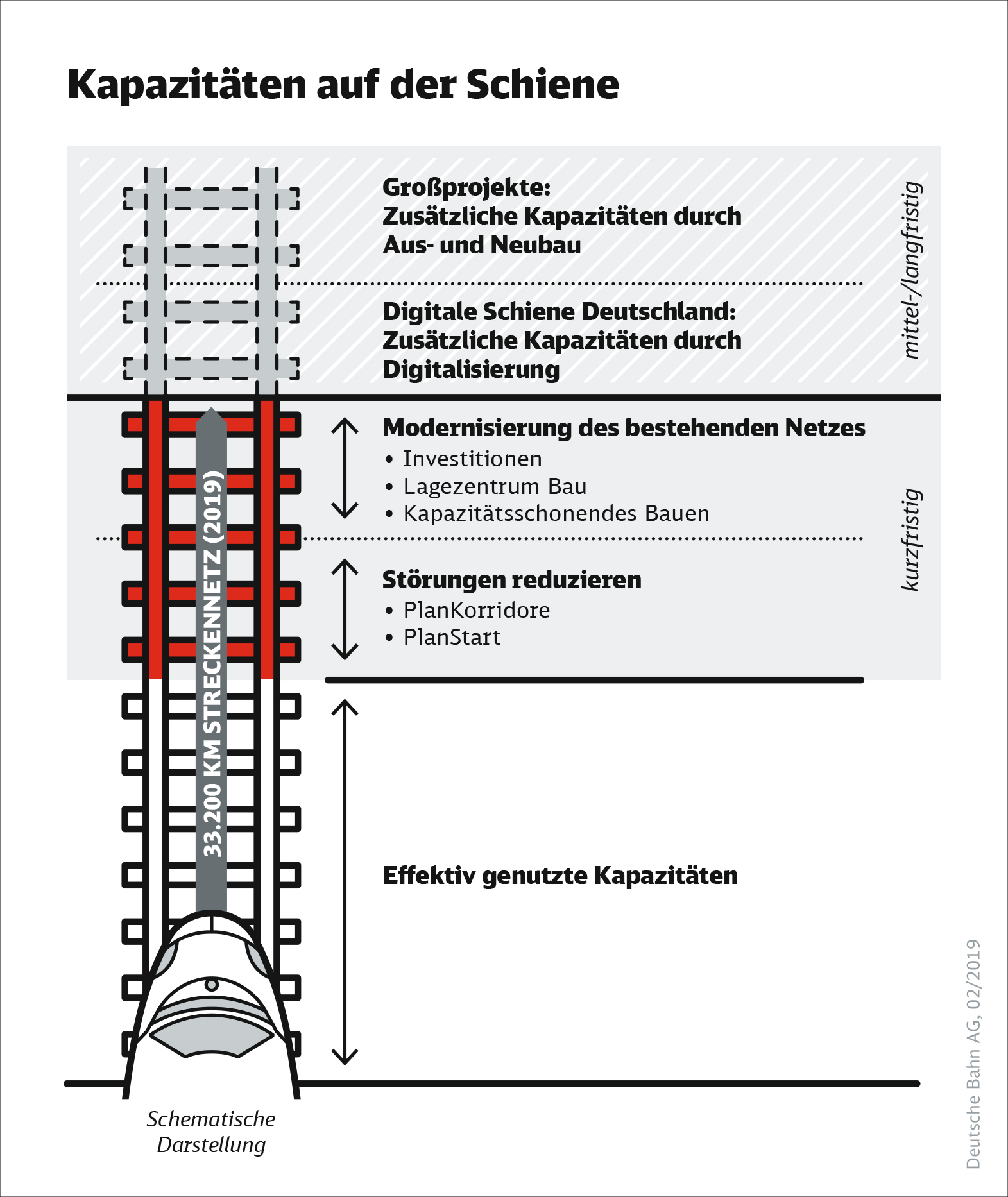 Für mehr Qualität im Zugverkehr hat die DB Anfang des Jahres die „Agenda für eine bessere Bahn“ aufgesetzt. Neben der Generierung von Kapazitäten bei Fahrzeugen und Personal geht es dabei vor allem darum, die hochbelastete Eisenbahninfrastruktur gezielt weiterzuentwickeln. Kurzfristig setzt die DB dabei weiter auf die konsequente Modernisierung des Schienennetzes und der Stationen. Gleichzeitig wird die bestehende Infrastruktur gegen Störungen robuster gemacht und mit den Eisenbahnen daran gearbeitet, das Spannungsfeld „Fahren und Bauen“ noch besser in den Griff zu bekommen. Mittel- bis langfristig schaffen der Aus- und Neubau von Strecken und Knoten sowie die Digitale Schiene Deutschland mehr Platz auf dem Schienennetz.