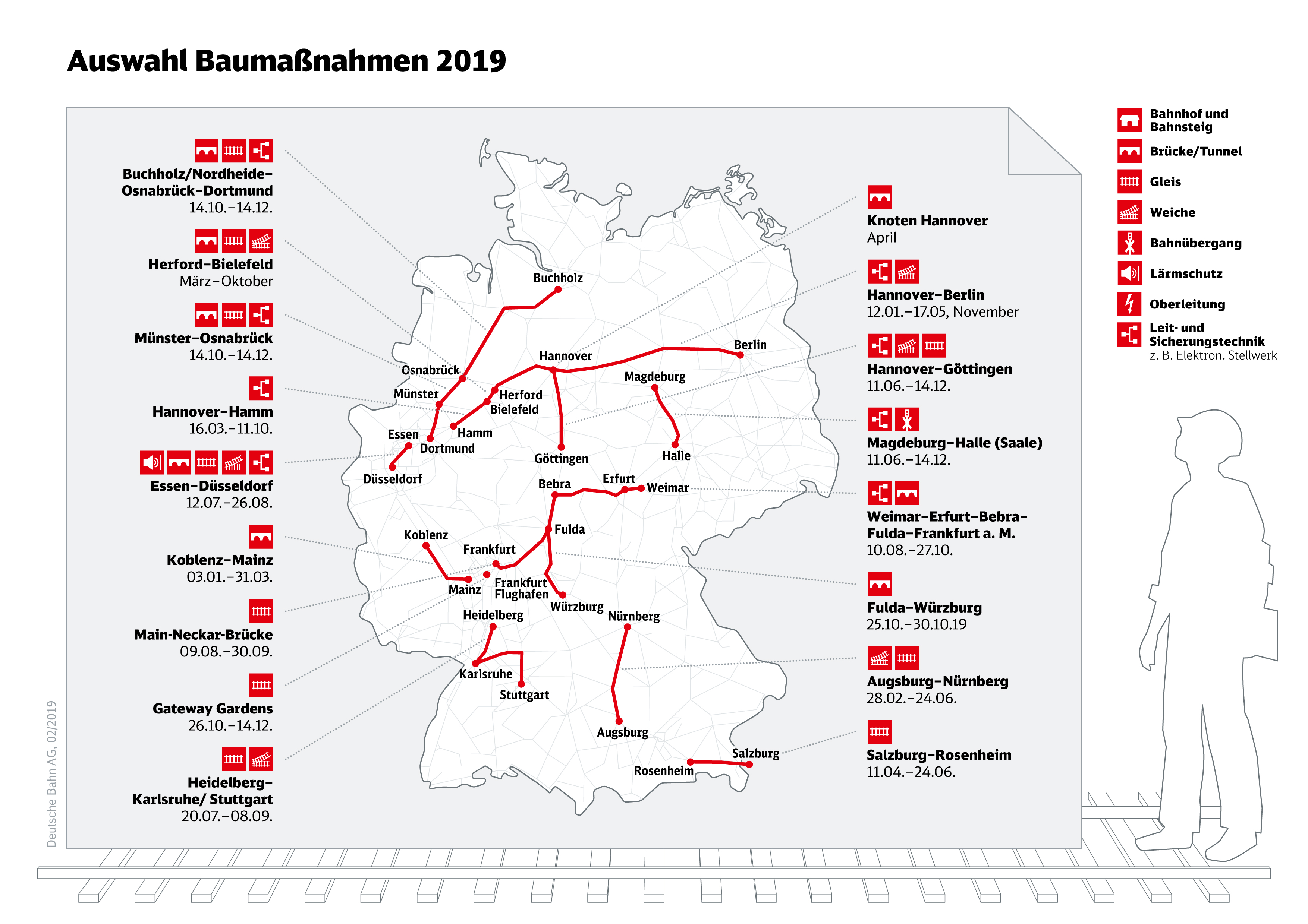 Im laufenden Jahr bringt die Bahn das Bestandsnetz und die Stationen mit insgesamt 10,7 Milliarden Euro weiter auf Vordermann. Konkret werden rund 1.500 Kilometer Gleise, über 300 Brücken und mehr als 1.500 Weichen erneuert sowie 650 Bahnhöfe modernisiert.