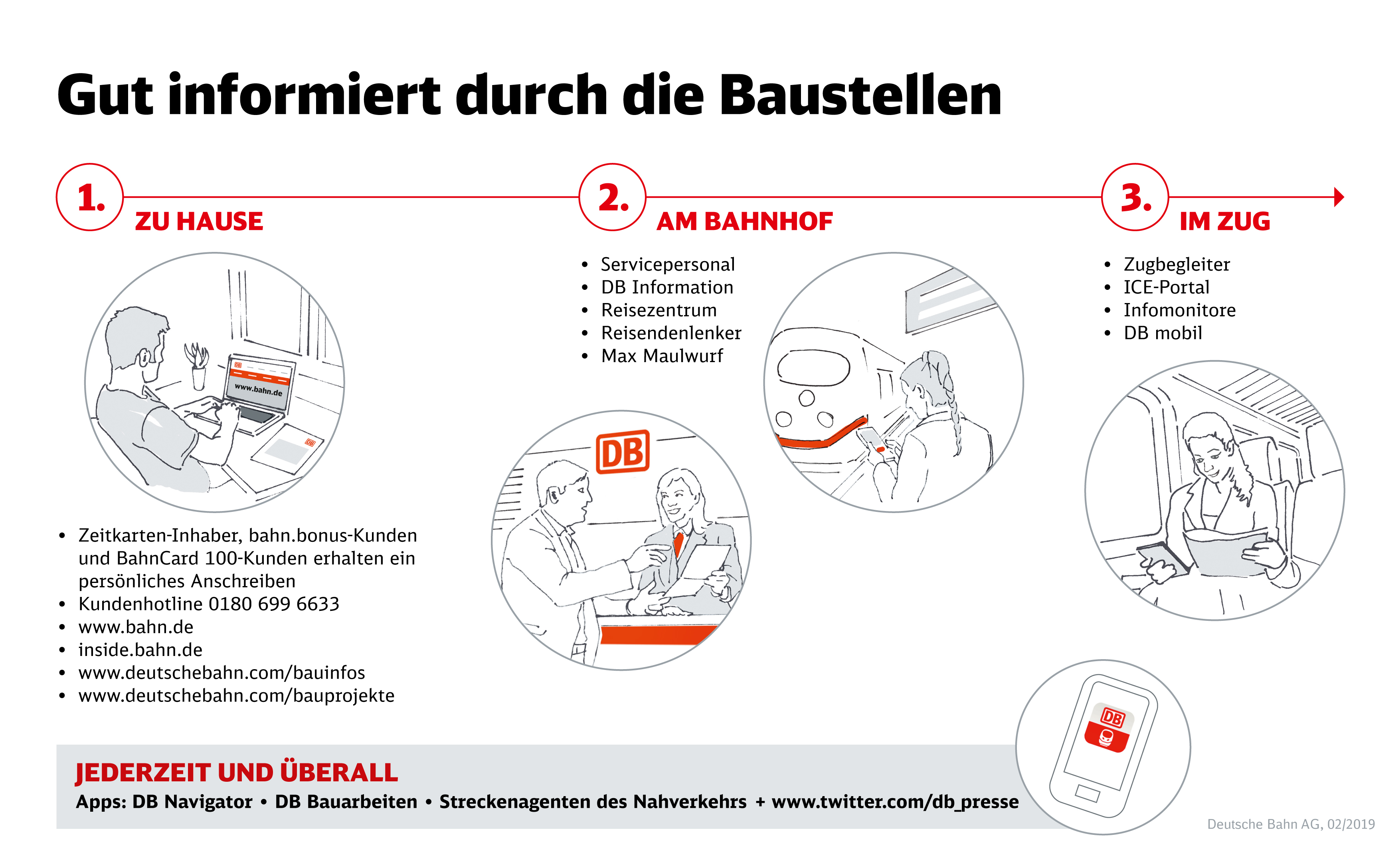 Informationen zu Zugverbindungen oder Ersatzverkehren gibt es zum Beispiel über den DB Navigator aber auch online, vor Ort an den Verkaufs- und Servicestellen sowie durch Max Maulwurf, den Baustellenbotschafter der Bahn. Verbesserte Wegeleitsysteme in den Bahnhöfen und zusätzliche Servicemitarbeiter kommen unterstützend hinzu. Bei außerplanmäßigen Verspätungen greifen besondere Regelungen, wie die Ausgabe von Gutscheinen.
