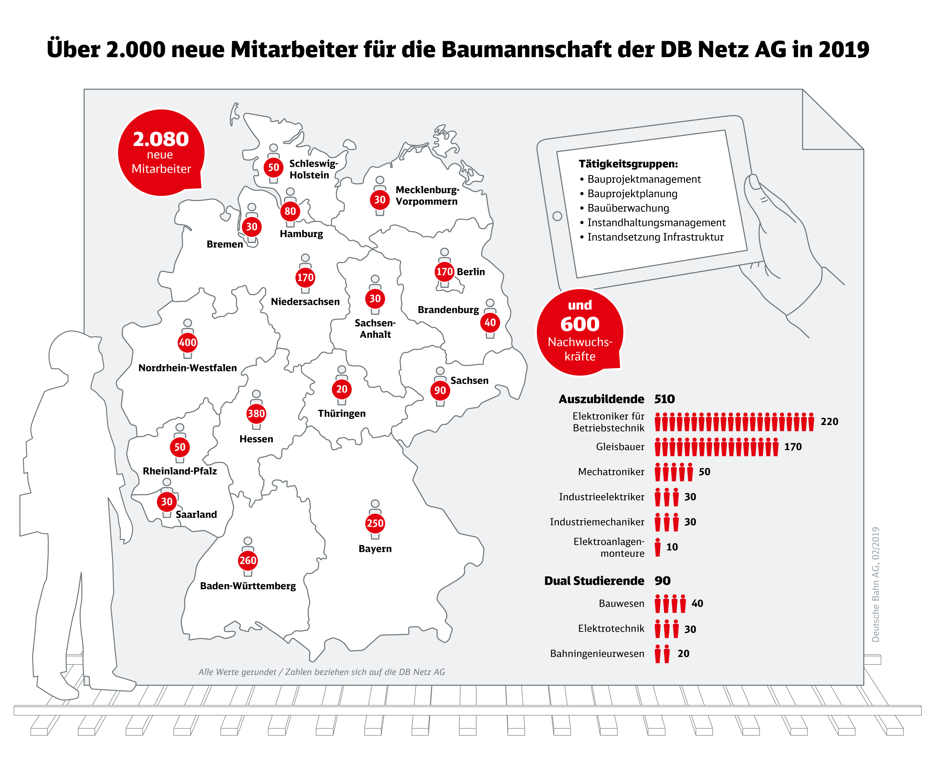 Rund um das Thema Bauen hat die Bahn auch beim Personal kräftig investiert. Über 1.500 neue Kolleginnen und Kollegen verstärken seit dem letzten Jahr allein bei der DB Netz AG wichtige Bau-Bereiche. Darunter Experten, die für bessere Bau- und Betriebsabläufe sorgen oder in der Fahrplanerstellung und Disposition im Einsatz sind. Auch Ingenieure und Gleisbauer sind neu hinzugekommen. Im laufenden Jahr sucht die Bahn in allen Bundesländern weitere Verstärkung - über 2.000 Mitarbeiter sind es bei DB Netz im Berufsfeld Bau.