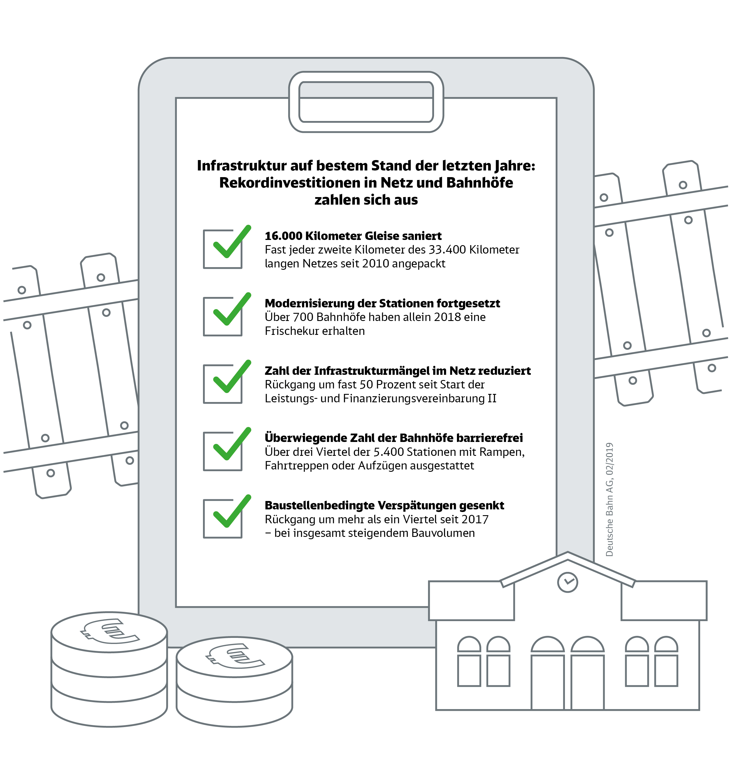 Gut vier Jahre nach Start des größten Modernisierungsprogramms für Schienennetz und Bahnhöfe hat die DB in der Infrastruktur bereits einen Qualitätsschub für ihre Kunden erreicht. Seit 2010 wurden fast die Hälfte der Gleise im 33.400 Kilometer langen deutschen Streckennetz saniert. Darüber hinaus hat die Bahn seit 2015 über 770 Eisenbahnbrücken modernisiert, deren Zustand mit einer Zustandsnote von 2,02 kontinuierlich als gut bewertet wird. Ende 2019 müssen gemäß den Vorgaben aus der Leistungs- und Finanzierungsvereinbarung II insgesamt 875 dieser Bauwerke erneuert sein – hier liegt die Bahn gut im Plan. Auch bei den bundesweit rund 5.400 Bahnhöfen ist die DB gut vorangekommen. So haben allein im vergangenen Jahr über 700 Stationen eine Frischekur erhalten. Mehr als drei Viertel von ihnen sind stufenfrei für die Reisenden erreichbar.